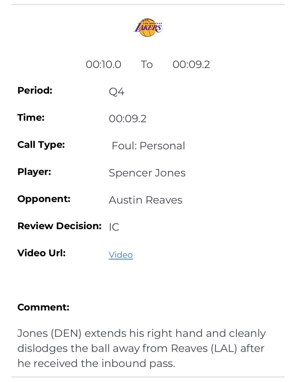 最后两分钟裁判报告认定,在常规时间还剩9.2秒时,里夫斯不应该获得两次罚球机会,因为斯班赛·琼斯的断球是合法的。