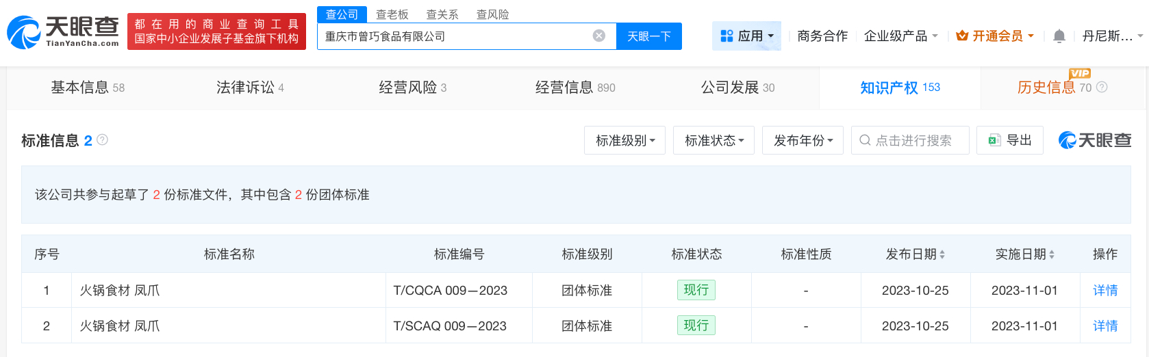 值得一提的是,上述三家公司均参与起草过食品相关企业标准,包括四川省蜀福香食品有限责任公司参与制定的速冻调制食品、酱卤肉制品质量通则等企业标准,重庆市曾巧食品有限公司参与制定的火锅食材 凤爪团体标准,成都市明扬食品有限责任公司参与制定的风味肉制品企业标准等。(天眼查)