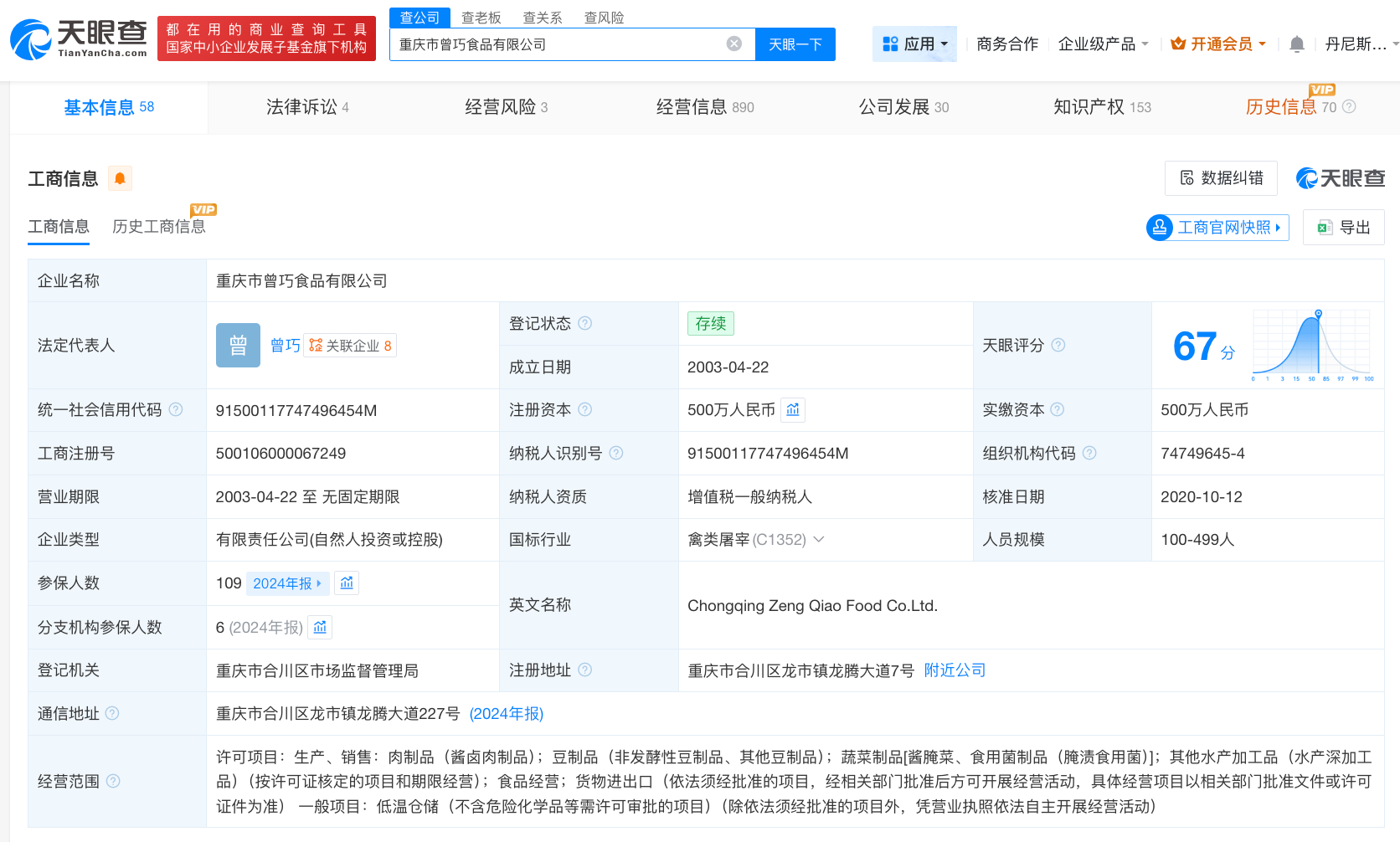 重庆市曾巧食品有限公司成立于2003年4月,法定代表人为曾巧,注册资本500万人民币,经营范围包括生产、销售:肉制品,豆制品,蔬菜制品等,由高家琴、曾巧共同持股。