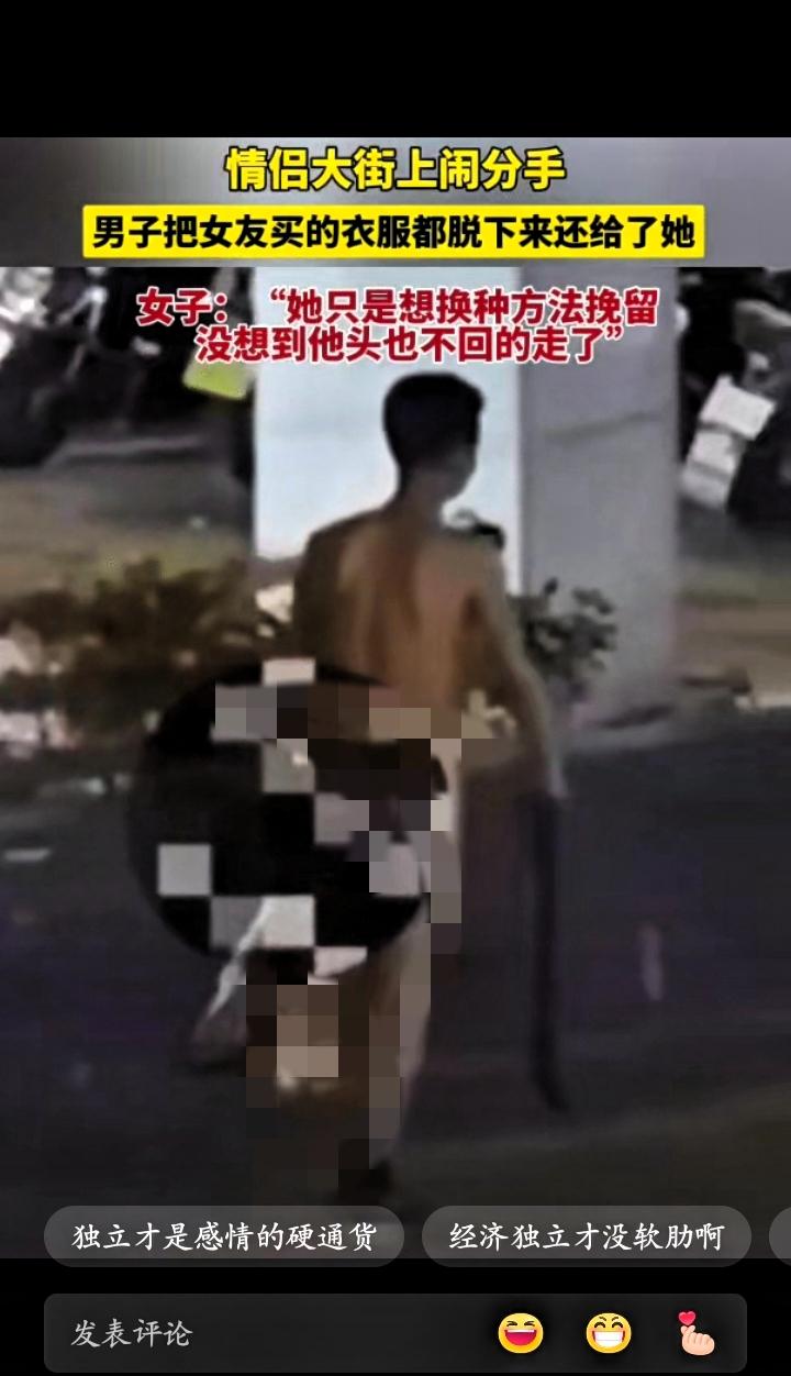 出乎意料,广东,一对情侣大街上闹分手,女子为了挽留男友,就对男友说:你如果要走,脱下自己赠送的衣物归还,男方随即在现场将衣物脱下后离开。 感情本是你情我愿,恋爱期间互相赠送礼物,是表达心意的方式,并非带有附加条件的交易。一旦走到分手这一步,用索要物品的方式宣泄情绪,不仅无法挽回关系,还会让双方都陷入尴尬与难堪。 女方试图用物质留住对方,可感情从来不是靠物品维系。当一个人愿意放弃外在体面,坚持离开,说明内心早已做出决定。这样的方式,既伤了对方,也轻看了曾经的相处。 男方的行为虽然出于情绪,但当众脱衣离去,也让自己失去了应有的体面。感情结束可以理性处理,用极端方式回应,只会让矛盾更加激化。 其实无论男女,在感情里都应该保持独立与尊重。经济独立,能让人在关系中更有底气;人格独立,能让人在分开时保持从容。真正成熟的感情观,是相爱时真诚付出,分开时体面退场。 索要礼物、当众争执、互相伤害,都不是处理分手的合理方式。曾经的陪伴无论长短,都不该以撕破脸收场。尊重对方,也是尊重自己,更是对过去感情的一种负责。 生活中,很多情侣分手时都会遇到类似问题,有人选择纠缠,有人选择释怀。其实最好的方式,是冷静沟通,不攻击、不羞辱、不极端。 感情有始有终,做人要有底线。愿每一个人在爱时认真,在散时从容,不困于情绪,不失掉尊严。