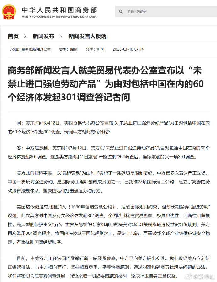 #商务部就美连续发起301调查答问#【商务部新闻发言人就美贸易代表办公室宣布以“未禁止进口强迫劳动产品”为由对包括中国在内的60个经济体发起301调查答记者问】问:美东时间3月12日,美国贸易代表办公室宣布以“未禁止进口强迫劳动产品”为由对包括中国在内的60个经济体发起301调查。请问中方对此有何评论?
