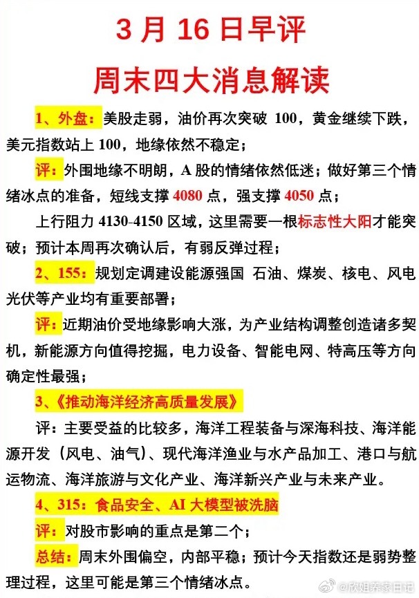 总结外围承压、内部政策托底,今天指数弱势整理为主,冰点附近不盲目割肉;仓位控好,盯能源、海洋经济、新型电力系统三条主线,等企稳信号再出手。