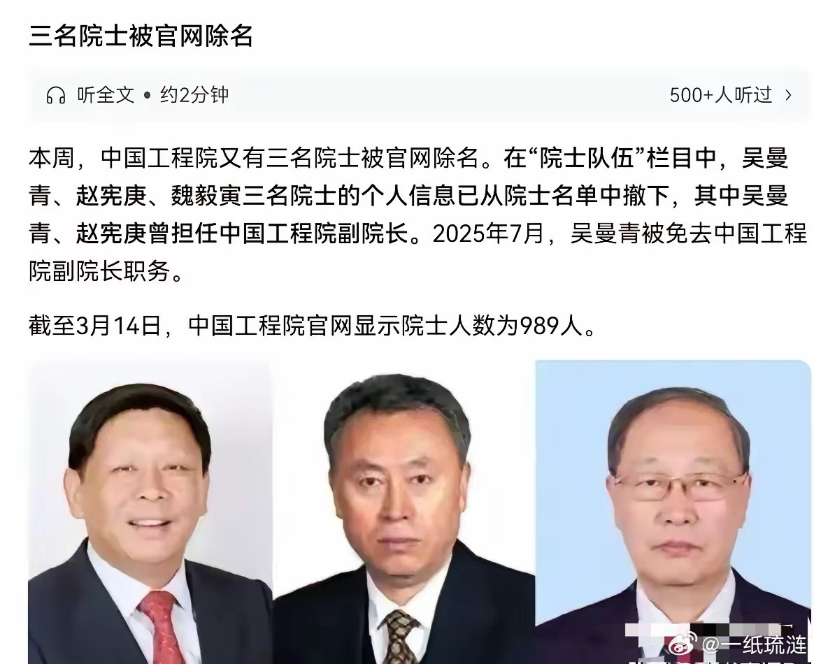 可能不是小事情!一天之内三名军工系统内的院士被除名,这真是不敢让人细想!3月15日,根据国内媒体报道,本周,中国工程又有三名院士被官网除名。这三人分别是吴曼青、赵宪庚、魏毅寅。这三位全是国防军工领域的核心专家,还曾担任重要管理岗位,分量极重吴曼青是空警-500预警机雷达关键负责人,赵宪庚深耕国防核物理科研魏毅寅主攻飞航导弹制导控制,每一位都曾扛起国之重器的研发重任院士是国家工程科技最高学术荣誉,军工领域更直接关联国家安全命脉按照工程院明确章程,触碰道德红线、触犯法律、危害国家利益都会被撤销称号这一处理不是突发之举,而是院士退出机制常态化刚性落地的体现过去不少人误以为院士是终身铁饭碗,贡献再大就能无视规则如今接连除名彻底打破误区,荣誉再高、资历再深也不能凌驾于制度之上无论身处哪个关键领域,只要失德违纪,就一定会被依规严肃处理军工战线是国家安全的坚固屏障,对科研人员的忠诚与底线要求本就更高三位核心专家被集中除名,释放出从严净化军工科研生态的强烈信号这不是否定过往成绩,而是守护国之重器研发环境的必要举措近年来已有多位院士被规范除名,覆盖多个关键行业,从严治院已成常态官方采取静默调整的方式处理,依规办事低调落实,尽显制度严肃性我们不必过度揣测,更不造谣传谣,一切以官方正式通报为准真正让人安心的,正是这种不徇私情、一视同仁的严格管理只有守住底线净化队伍,科研环境才能更清朗,国防科技才能更稳固让院士称号回归荣誉本质,科研工作者才能心无旁骛为国攻关这也给全体科研人员敲响警钟,荣誉越高责任越重,家国底线绝不能破军工报国从不是口号,是刻在骨子里的忠诚担当,容不得半点私心杂念唯有坚守初心严守规矩,才能不负国家重托,不负人民的殷切期待规则面前人人平等,荣誉面前更要心存敬畏国家守护科研诚信与国防安全的决心,始终坚定不移零容忍这样的严管厚爱,才是对科研事业、对国家安全最负责的态度各位读者你们怎么看?欢迎在评论区讨论。