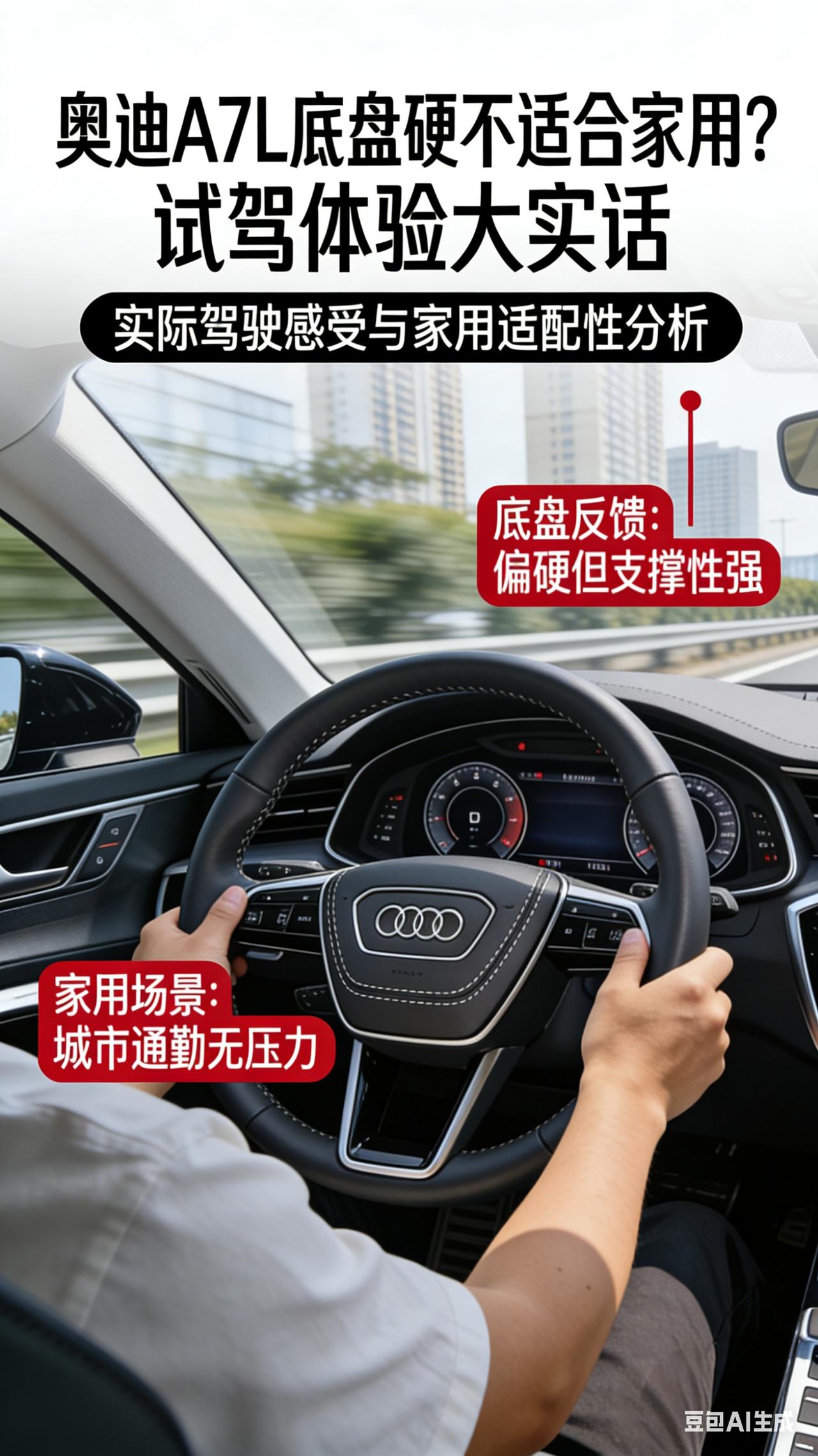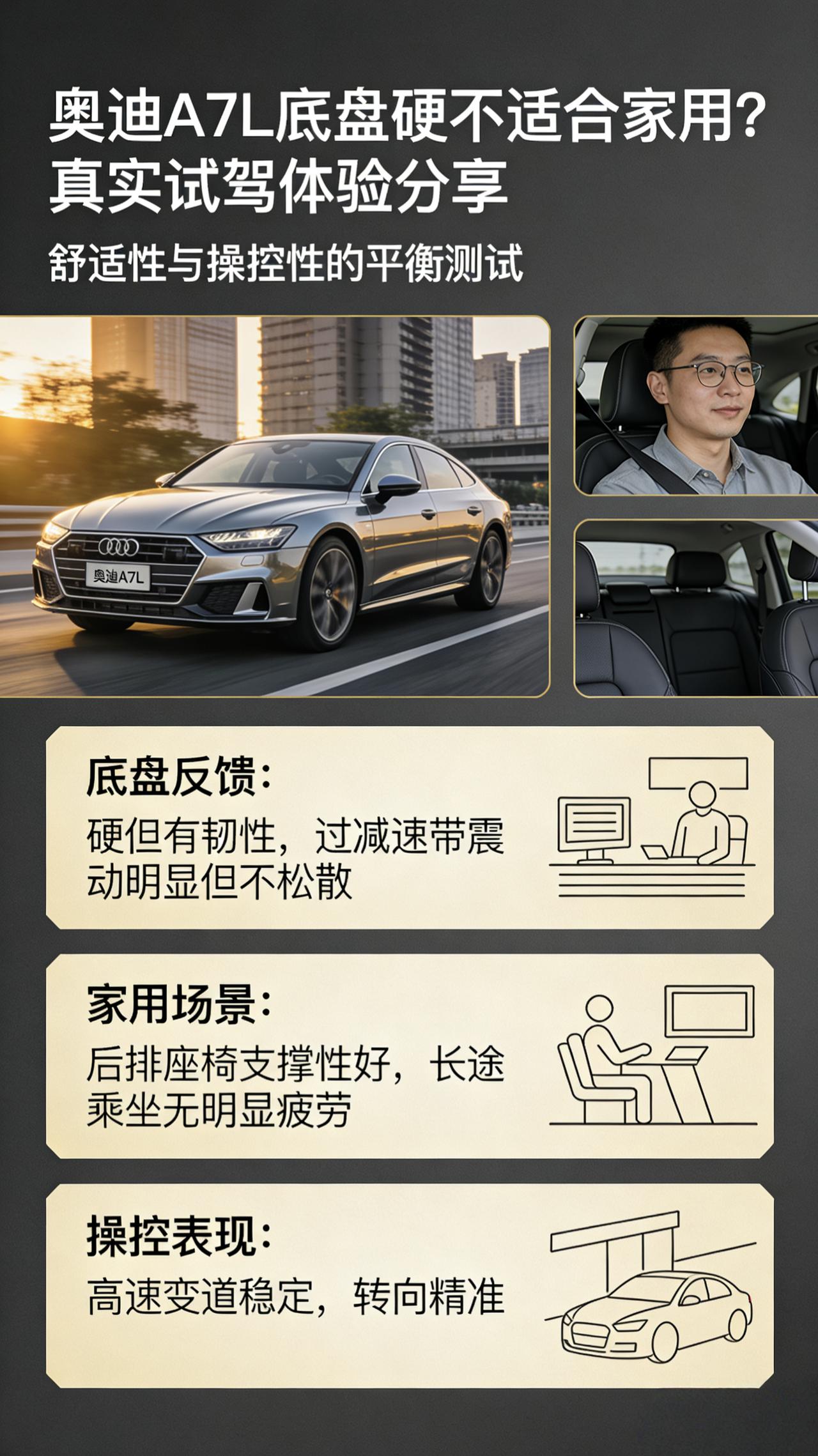 都说A7L底盘硬不适合家用?我替你们狠狠地试了试,大实话全在这! 最近后台总有兄弟问我,奥迪A7L这车到底能不能买?尤其是那些本来想看A6L的,结果被A7L的颜值勾走了魂,但又担心网上说的:“这车底盘太硬了,运动是运动,家里有老人小孩的遭老罪咯。” 说实话,我也被这个说法困扰了很久。直到上个周末,我特意找了一条包含了减速带、烂路和高架的混合路段,把A7L(45 TFSI四驱版)狠狠地试了两个来回。 今天咱们不聊那些虚的配置单,就单纯聊聊这副底盘给我的“打脸”经历。 第一感觉:嘿,这底盘怎么“精分”了? 刚起步在市区蠕行的时候,我心里还咯噔了一下。因为压过第一个井盖,路感确实挺清晰,方向盘能感觉到细微的震动。但神奇的是,这种震动并不会像某些性能车那样,“哐当”一下直接砸进车厢里。 它更像是穿着薄底鞋踩到了小石子,你能感知到,但脚底并不疼。 销售在旁边补了一句:“试试调驾驶模式。”当我从舒适模式切换到动态,好家伙,这车瞬间像换了个人。悬架明显绷紧了,过弯时侧倾控制得特别好。我这才反应过来,A7L的底盘不是单纯的“硬”,而是那种带着韧劲的“Q弹”。 它把大部分不舒服的细碎颠簸其实都在第一下过滤掉了,留给你的只是必要的路感。 专门去找“烂路”较劲 为了验证它到底适不适合家用,我愣是开回了公司附近那条被大车压坏的破损路面。 这一段是真正的考验。如果底盘像网上说的那么不堪,这里我估计得被颠得七荤八素。但结果让我挺意外,面对这种连续的小坑洼,A7L的悬挂收缩回弹非常快,没有那种多余的晃晃悠悠。通俗点说,就是车身能很快地被“拽住”,不会像船一样忽忽悠悠。 我特意坐了后排,同行的小伙伴说感觉底盘很“整”,不松散。 非要找点毛病的话,如果遇到那种很高的减速带,而且你是快速冲过去的,后桥确实会有一声比较沉闷的“咚”一声,冲击感会比A6L直接一点。 但话说回来,正常人开这车,谁会天天不减速过减速带呢? 跑起来之后,才是它的舒适区 后来上了高架,我发现这副底盘的精髓其实在高速。稳,是真的稳。无论是变道超车还是被大车带起来的气流冲击,A7L的四个轮子就像被吸在地上一样。这种贴地飞行带来的安全感,反而是一种高级的舒适。 总结一下我的个人看法: 我觉得大家对A7L的底盘有误解。它不是那种软塌塌的美式大沙发风格,它是典型的欧系风味——韧性十足、支撑到位。 如果你买车只是为了极致地软,为了过任何沟坎都像抹了油一样,那可能A6L或者一些美系车更适合你。 但如果你跟我一样,平时大部分时间自己开,想要一点驾驶乐趣,周末又要带着家人出门,不希望家里人坐起来晕车,那A7L这套底盘其实是兼顾得非常好的。 它的“硬”是假象,那种扎实的“厚重感”才是真相。 有没有开A7L的兄弟,或者当时在这俩车间纠结过的?来评论区聊聊你们真实的感受,我也想验证一下我开的这台是不是个例!【来自懂车帝车友圈】