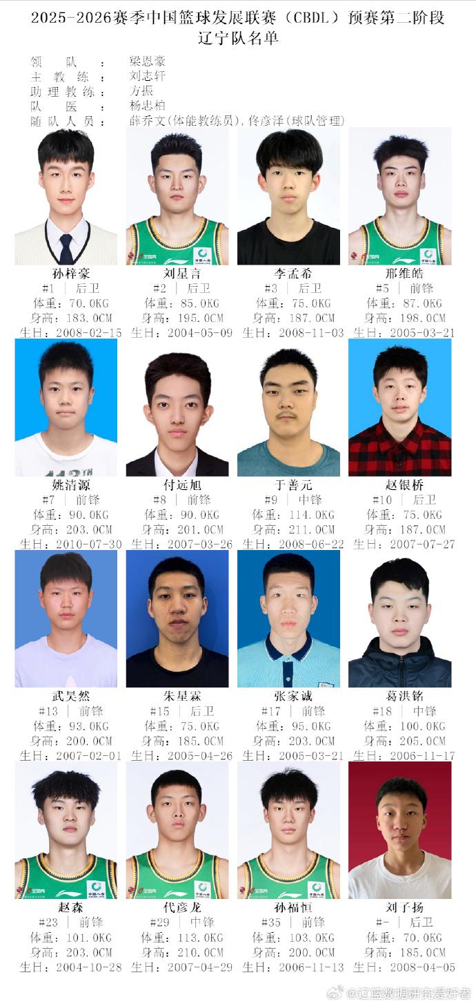 3月18日中篮球发展联赛(CBDL)将在辽宁阜新开赛,杨鸣作为开幕式嘉宾参与开幕式活动。 本次CBDL联赛主要是CBA各支球队的二队球员参加,性质类似NBA发展联盟。 此次在辽宁阜新举办的CBDL比赛一共有六支球队参加,他们分别是辽宁沈阳三生(辽宁二队)、天津荣钢、上海久事、青岛国信、南京同曦、浙江稠州。 比赛时间:2026年3月18日—3月22日(共5天) 附图中有本次辽宁队参赛球员名单(由辽篮数据研究爱好者制作)