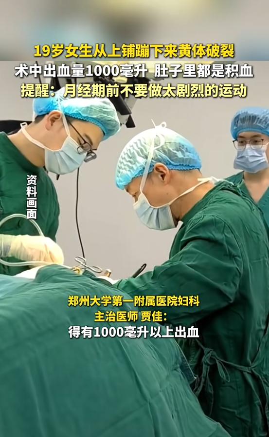 “太吓人了!”河南郑州,一19岁女生从宿舍上铺蹦下来后,突发剧痛,便去医院就诊,到医院时,女孩面色惨白,最终确诊为黄体破裂,腹腔大量出血,并且积血都到了肝脏,术中发现她盆腔积血至少有1000毫升以上,情况十分危急! 河南郑州一所高校的宿舍里,原本平静的午休被一声急促的响声打破。一名19岁的女生从上铺蹦下来准备去上课,刚一落地,下腹部突然传来一阵撕裂般的剧痛,疼得她瞬间弓起身子,冷汗直流,脸色瞬间变得惨白如纸。 同宿舍的室友见状,赶紧上前搀扶,却发现她根本站不住,每动一下,疼痛就加剧一分,甚至连呼吸都变得困难。 室友不敢怠慢,立刻叫了校医,校医简单处理后建议立即送医,于是一行人火速赶往郑州当地一家三甲医院急诊。 到医院时,女生的情况已经岌岌可危。她面色惨白,嘴唇毫无血色,整个人虚弱地瘫坐在轮椅上,浑身止不住地发抖,嘴里低声呻吟着,原本清亮的声音变得微弱无力。 接诊医生通过初步问诊和腹部触诊,敏锐地察觉到情况不简单,当即安排了腹部B超和CT检查。 检查结果出来,让在场的所有人都倒吸一口凉气。 超声影像清晰地显示,女生腹腔内有大量游离液体,盆腔积血极其严重,甚至已经蔓延到了肝脏边缘。 医生紧急安排手术,术中的情况比预想的还要凶险——医生从盆腔内清理出的积血和血块,总量超过了1000毫升,这相当于一个成年女性全身血液的近四分之一! 罪魁祸首,是黄体破裂。 原来,这名女生正处于月经周期的后期,卵巢黄体形成,内部血管丰富,结构相对脆弱。她从上铺跳下时,巨大的冲击力导致腹压瞬间增高,引发了黄体破裂。 黄体破裂本身是青年女性常见的急腹症,但很多人以为只是普通的腹痛,殊不知一旦破裂口伤及大血管,短时间内就能引发失血性休克,一旦抢救不及时,后果不堪设想。 手术台上,医生们沉着应对,迅速止血、清除积血,经过几个小时的紧张奋战,终于成功控制住了出血,将女生从死亡线上拉了回来。 术后,女生被送进重症监护室观察,虽然脱离了生命危险,但回想起当时的情景,依然心有余悸。 这件事在网上传开后,评论区炸了锅,年轻网友们纷纷表示“太吓人了”,并分享了自己的类似经历。 有网友留言:“真的不敢大意了,我上次也是黄体破裂,医生说刚好在血管上,差点就没了,以后下床真的要慢一点。” 还有网友科普:“黄体破裂真的很隐蔽,很多人以为是痛经或者岔气,其实这种突发剧痛绝对不能忍,一定要立刻就医。” 也有网友表示后怕:“19岁正是青春好动的年纪,很多人都不知道这个风险,希望学校能多普及一下生理急救知识。” 医生特别提醒,年轻女性在月经中后期,尤其是剧烈运动、用力咳嗽或蹦跳后,若突然出现一侧下腹部剧痛,千万不能掉以轻心。 黄体破裂的痛感有时类似阑尾炎,但它是致命性的出血,及时就医是唯一的生路。 对此,你们有什么看法,欢迎评论留言~
