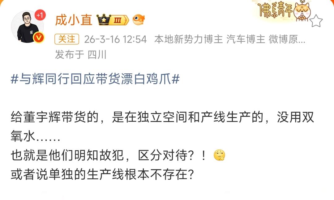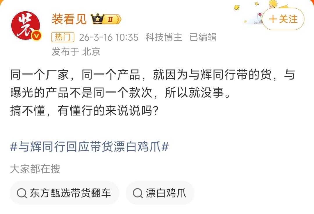 315蜀福香双氧水鸡爪的事,怎么还有人不分青红皂白往与辉同行和董宇辉身上泼脏水啊? 先把话说死:人家直播间带的鸡爪,和315曝光的问题货,根本不是同一条生产线、不是同一个批次! 选品的时候就把厂家资质、对应批次的检测报告查了个底朝天,全都是符合国家食品安全标准的,半毛钱违规都没有! 合着厂家别的生产线偷偷犯浑,就得把所有合作方都一棍子打死? 人家从头到尾严卡品控,守着自己供货的生产线做全流程审核,结果厂家背地里搞小动作,人家也是实打实的受害者啊! 一直靠粉丝信任吃饭的团队,怎么可能拿大家的入口安全开玩笑?别听风就是雨乱带节奏,别把无辜的人往火坑里推行不行!