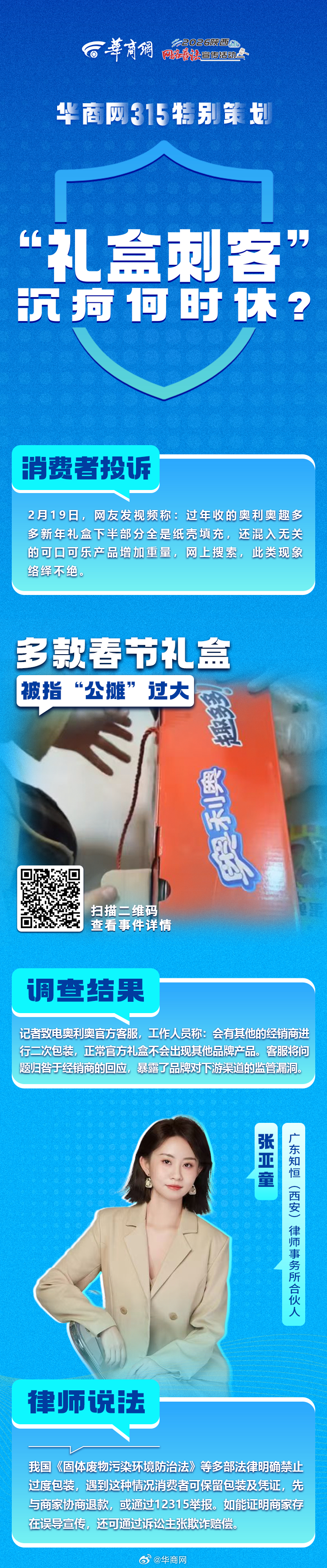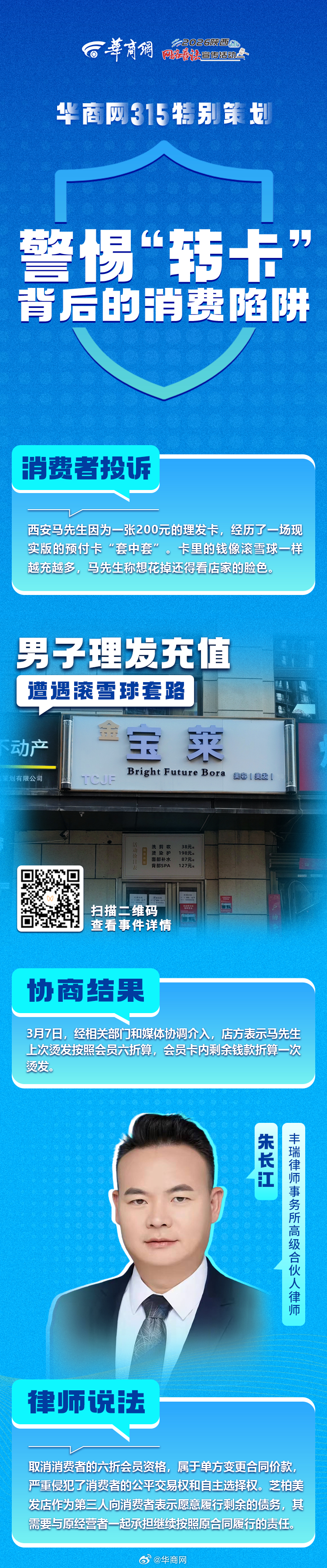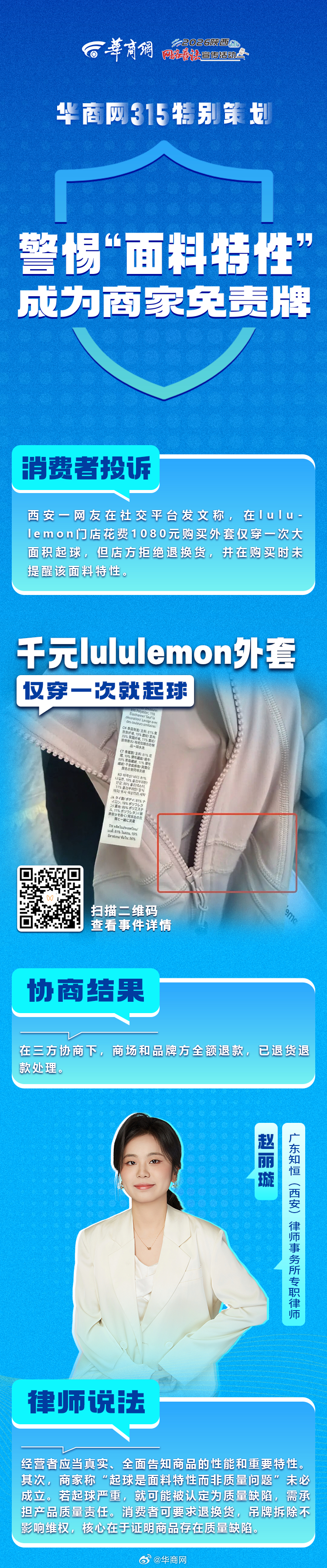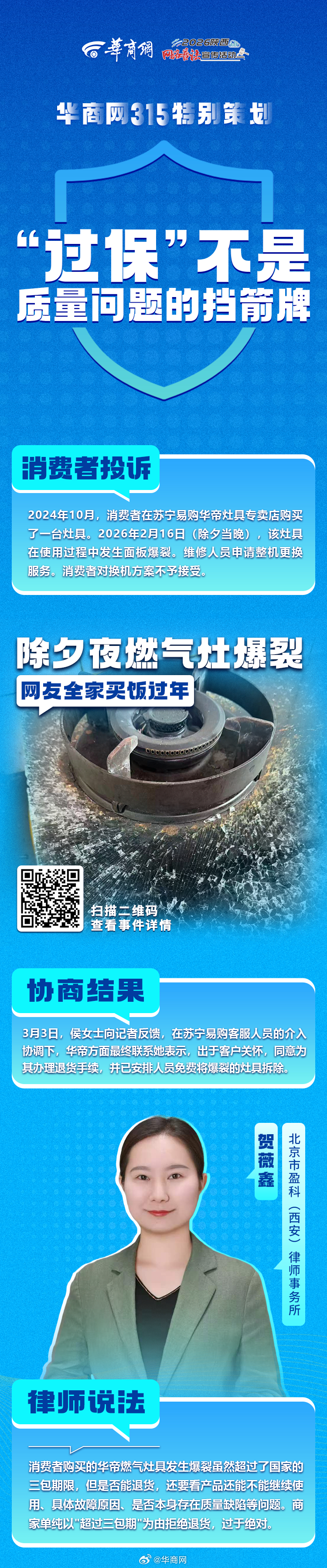 【#华商调查守护消费者权益#】近期,收到网友大量投诉:千元外套穿一次起球、除夕夜燃气灶爆裂全家买饭过年、理发卡充值遭“滚雪球”套路……面对质量问题、消费陷阱等线索,记者第一时间走访调查、多方沟通,为多位网友成功维权!戳图↓↓查看维权案例。如果您也遇到消费糟心事,扫描图中二维码留下您的线索,华商网继续为您发声! #消费维权不止315#