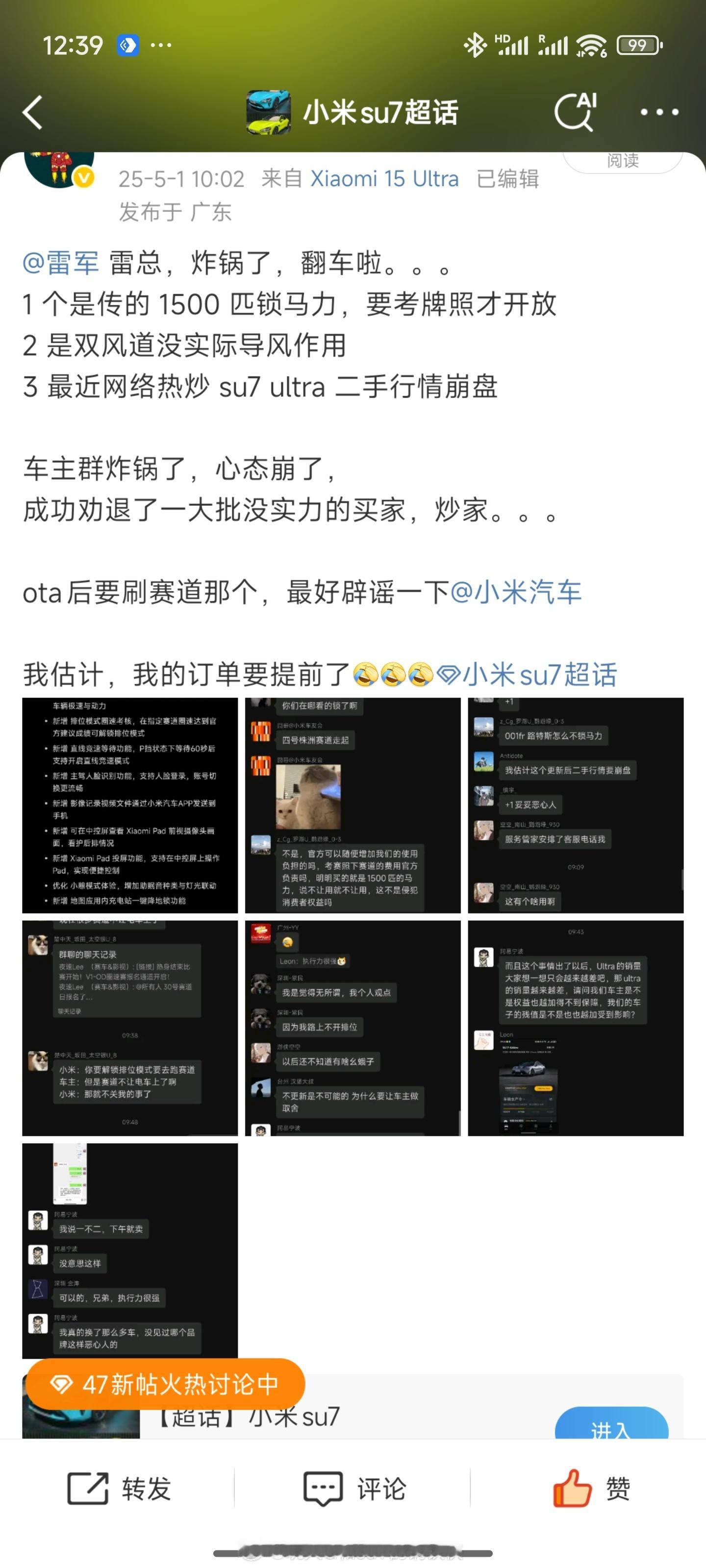 雷总,炸锅了,翻车啦。。。1 个是传的 1500 匹锁马力,要考牌照才开放2 是