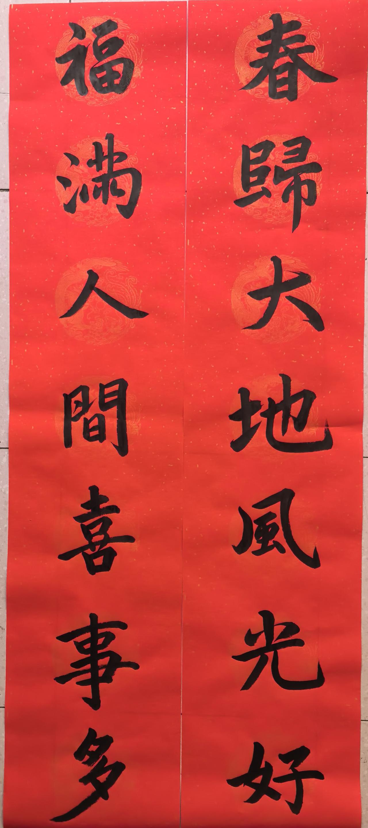 上联:三寸笔杆书天下; 下联:一方徽砚写经年。