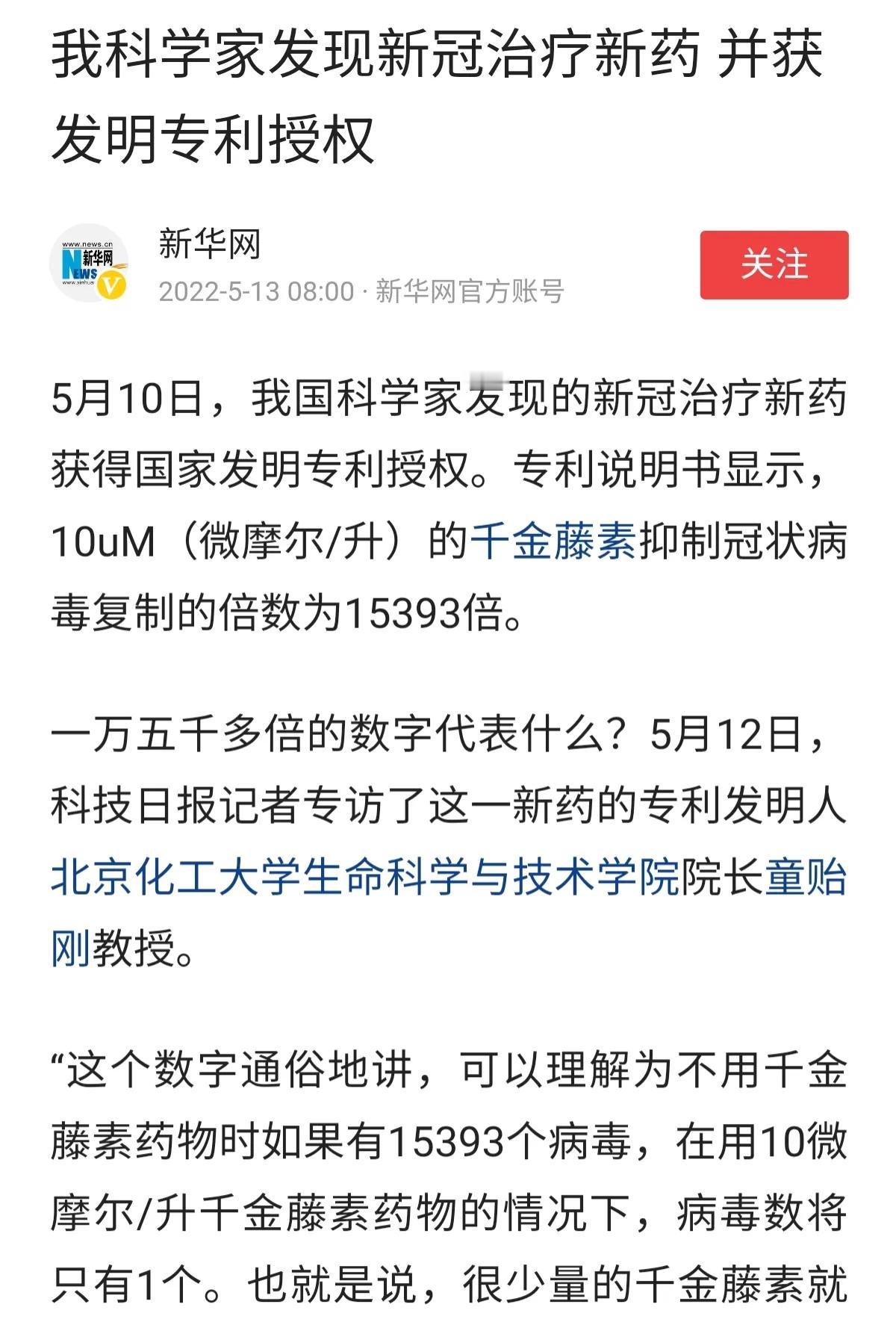 15393,数字实在喜人,这可是千金藤素抑制冠状病毒复制的倍数啊!我国科学家发现的新冠治疗新药获得发明专利授权,核心就在千金藤素上。 千金藤,我可是非常了解熟悉的,它是山乡老家的一种普通中药材,小时候经常会到山上寻找,运气好的话有时能够找到一大片,通常都会采挖根藤回家,父母拿到附近的集市上售卖,如今只剩下美好的回忆了。 从2020年开始,疫情彻底改变了很多人的生活,原本轻松自如的回家之路,因为疫情而变得纠结艰难,与亲人团聚一次又一次推迟或取消,走动亲人朋友越来越稀缺。 期待这一株不起眼的小小千金藤,给我们的未来生活带来希望之光,以它的万倍抑制功力,灭尽新冠之病毒,驱散疫情之阴霾!