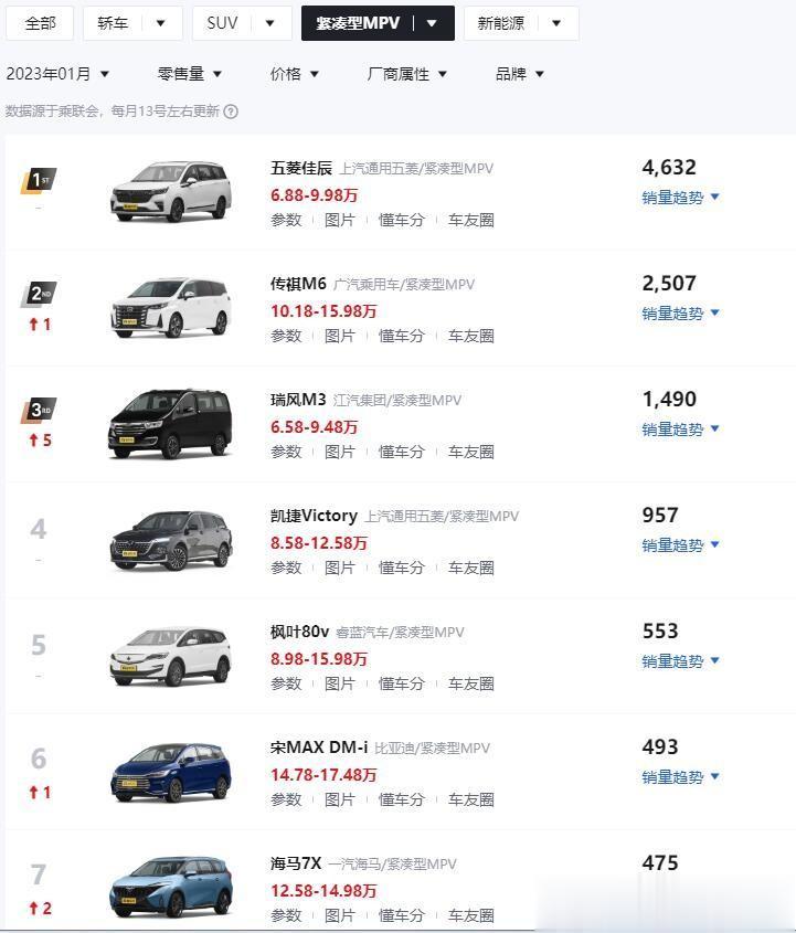 1月销量破千的紧凑型MPV只有3款!1月紧凑型MPV榜单当中,有20款车型有销量数据;销量破千的紧凑型MPV只有3款,分别是1490辆的瑞风M3、2507辆的广汽传祺M6,以及4632辆的五菱佳辰;销量不到10辆的车型有2款:9辆的嘉际PHEV,以及1辆的长安欧尚A600 EV!