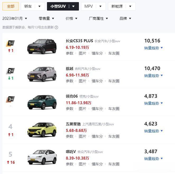 10516辆!1月小型SUV的月销冠军是长安CS35 Plus!在乘联会公布的1月汽车销量榜单之中,冠军是10516辆的长安CS35 Plus;亚军是10470辆的吉利缤越,这两款车型的销量差距只有46辆;但是第三名领克06的销量仅仅是4873辆,可见小型SUV的冠军之争非常激烈,但是仅限于长安CS35 Plus和吉利缤越两个车型之间!
