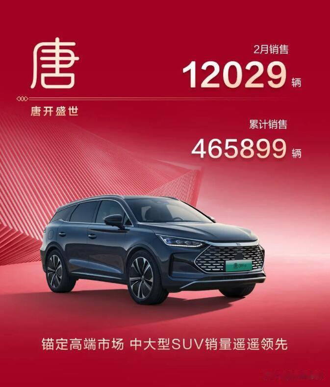 12029辆!比亚迪唐持续锚定高端市场!比亚迪唐的1月销量只有8890辆,2月销量跨过1万辆门槛,来到了12029辆;唐的定位是中大型SUV的高端市场,销量一直遥遥领先,锚定高端市场的比亚迪唐,历史累计销量达到了465899辆!