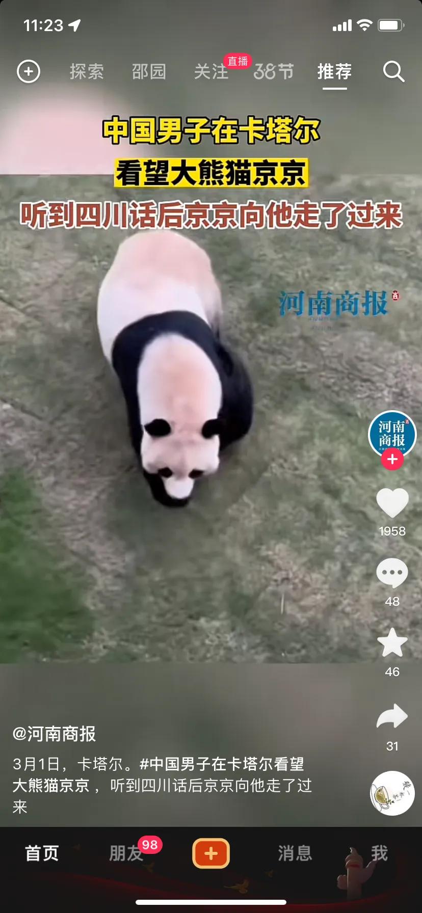 中国男子在卡塔尔用四川话喊大熊猫京京,然后京京就过来了,大熊猫也体验了“他乡遇故知”。希望在国外的国宝们都能被温柔以待。