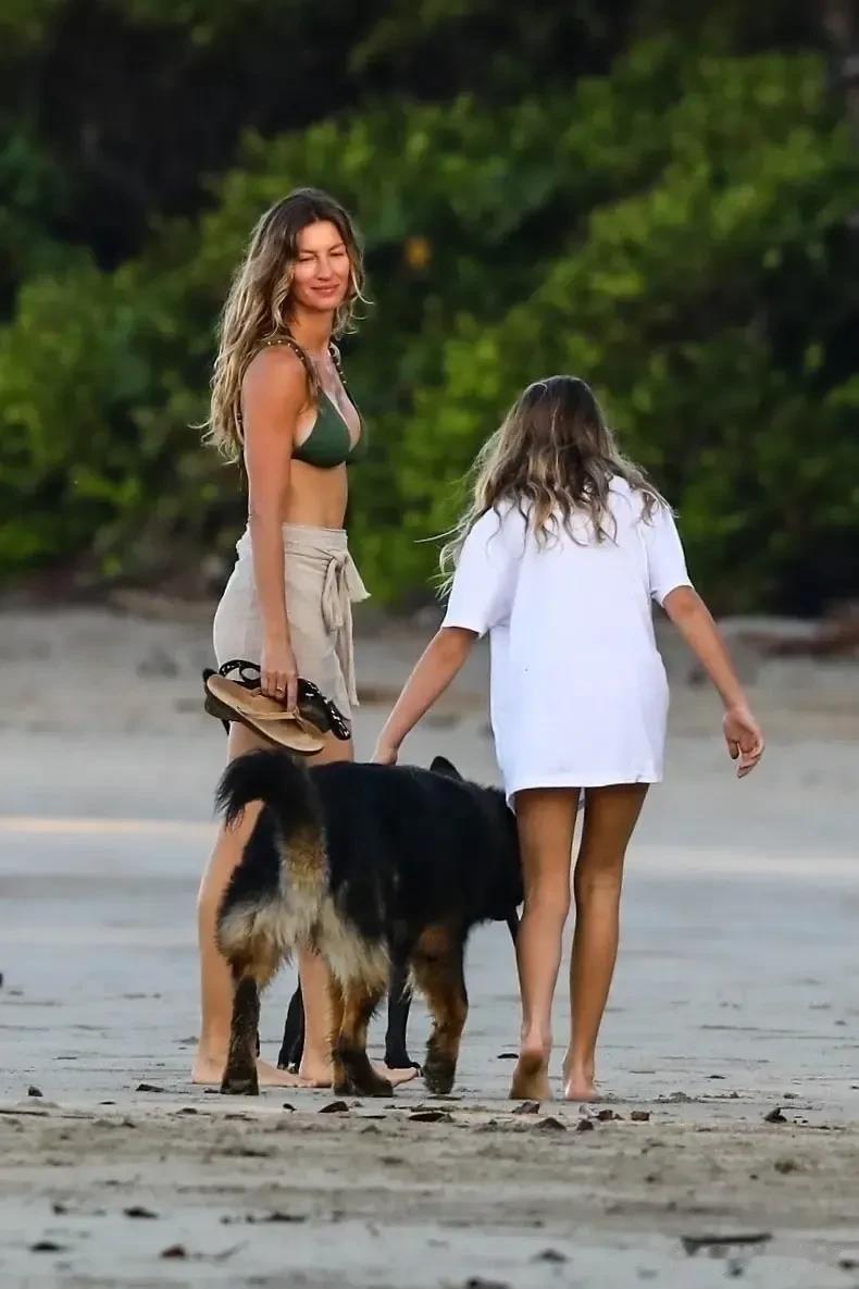 超模吉赛尔·邦辰与女儿漫步哥斯达黎加海滩 在工作拍摄间隙,吉赛尔和13岁的女儿,还有两只狗狗,一起光着脚丫漫步海滩,共度美好时光。 42岁的吉赛尔,不愧是超模出身,都这个年龄了,修长的身材依然挺拔如昨!