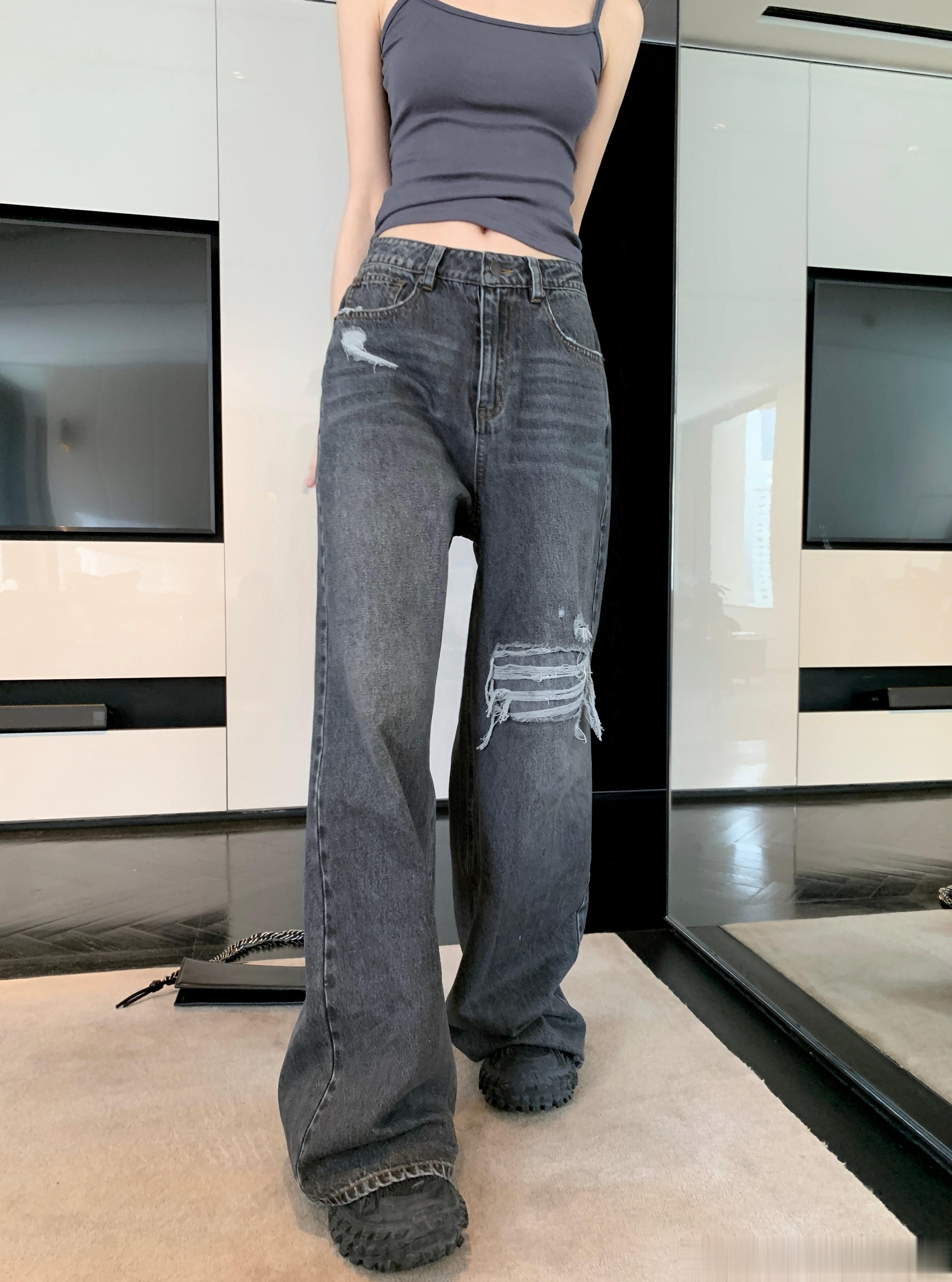 面料是全棉牛仔布 制作上需要经过2道工艺 腿部的破洞毛边需要先水洗出效果 再拼缝里面的贴布