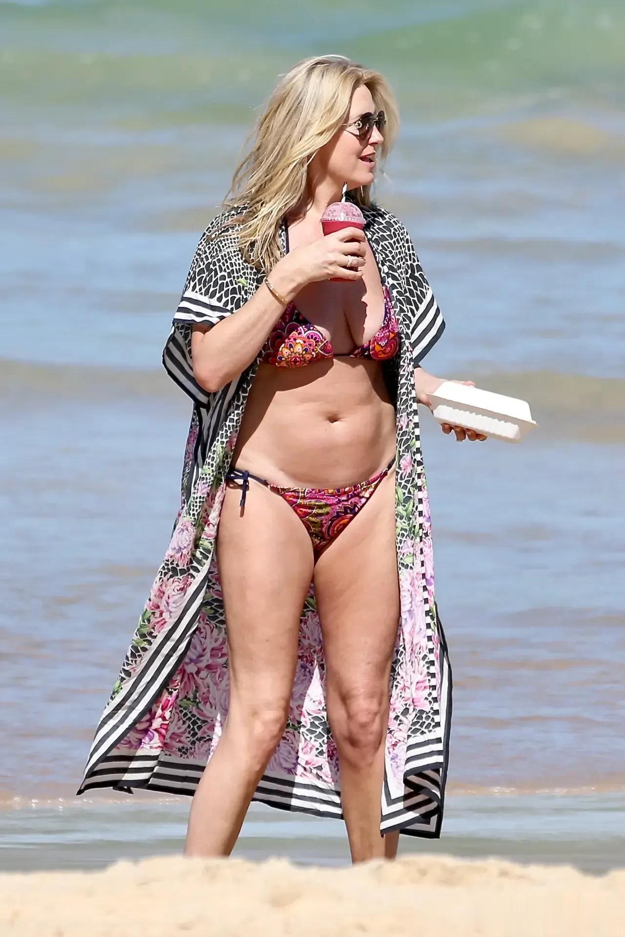 52岁的潘妮·兰开斯特,是英国著名摇滚明星罗德·斯图尔特的第三任妻子,曾是一名内衣模特。 最近她带着孩子,陪78岁的老公来澳大利亚度假。 身着红色花纹吊带比基尼的潘妮,身材健硕挺拔,金色长发随着海风和波涛一起荡漾,惊艳了整个海滩。 粉丝们不由得惊呼: 不老的潘妮·兰开斯特!
