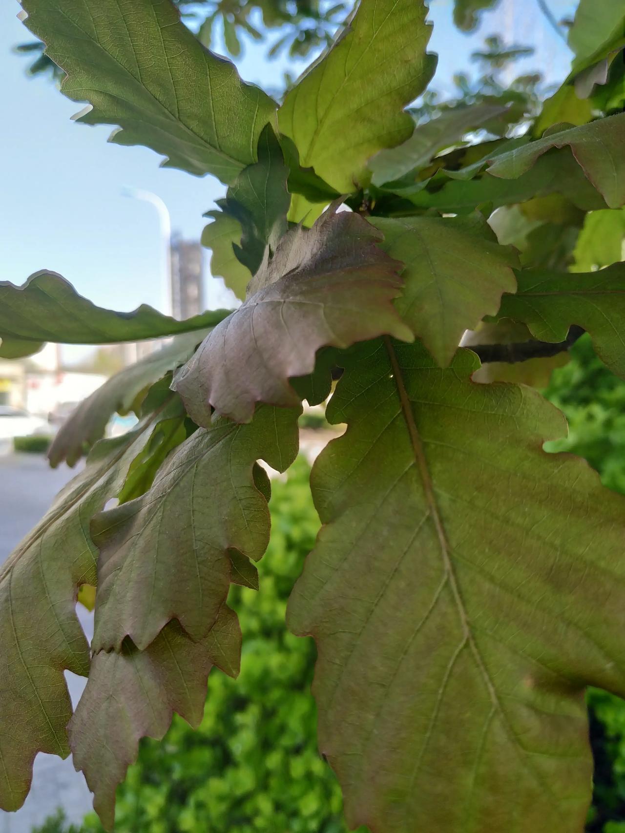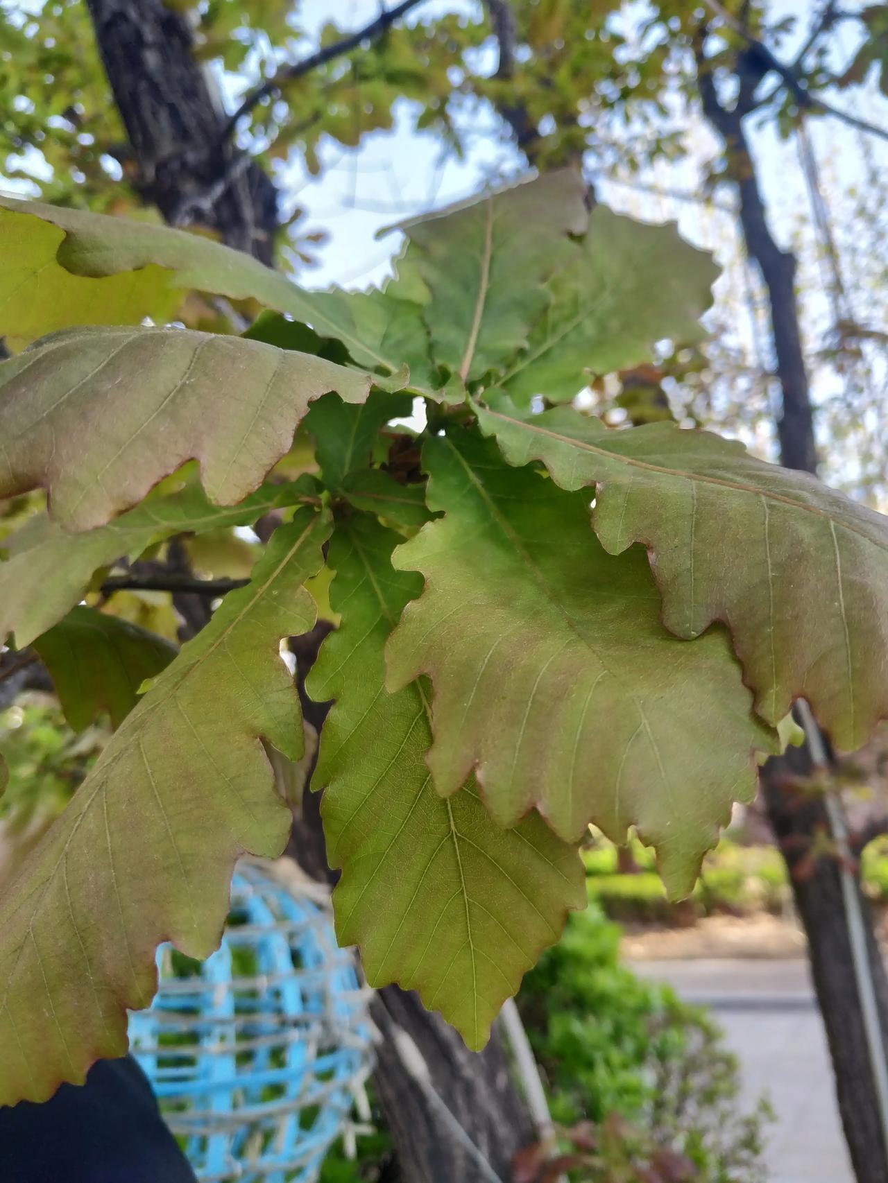 这是什么?叶片类似芭蕉扇的形状,边缘成锯齿状,叶片丛生,植株高大,主干也是丛生。大家会在很多售楼处门口看到这种树,小区和公园则比较少,这种树的名字是:丛生蒙古栎(li)。 该树普遍生长于北方地区,属于落叶乔木,蒙古栎是真的能结栗子的,在叶片聚集的中心会结果,和普通栗子有些区别,具体我也见得不多,因为一般园林树种结果都不太好,也不知道这株是不是原生的样子。
