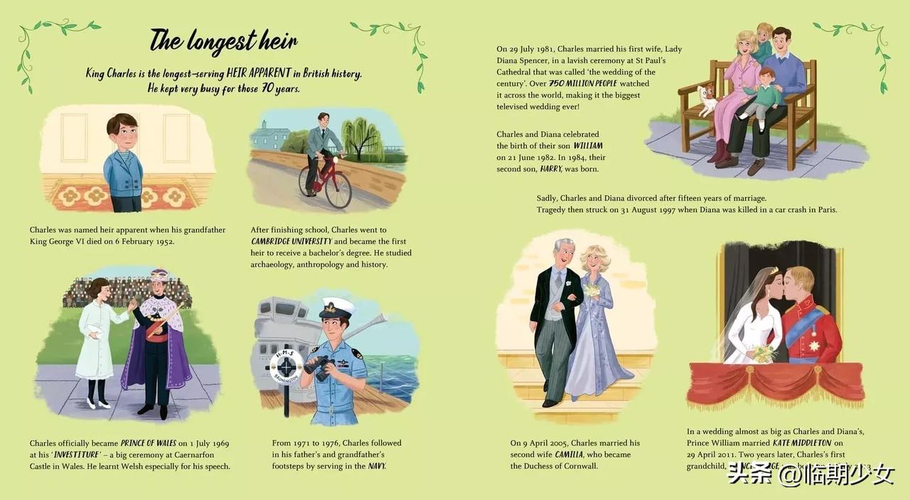 看看英国王室是怎么向儿童介绍查尔斯的一生的。其中关于戴安娜的介绍是这样写的: “不幸的是,在结婚15年后,查尔斯和戴安娜离婚了。悲剧的是,1997年8月31日,戴安娜在巴黎遭遇车祸身亡。2005年4月,查尔斯娶了他的第二任妻子卡米拉,也就是后来的康沃尔公爵夫人。” 把一场悲剧,描述成普通的结婚、离婚,把查尔斯和卡米拉的婚姻合理化。真是令人唏嘘啊!