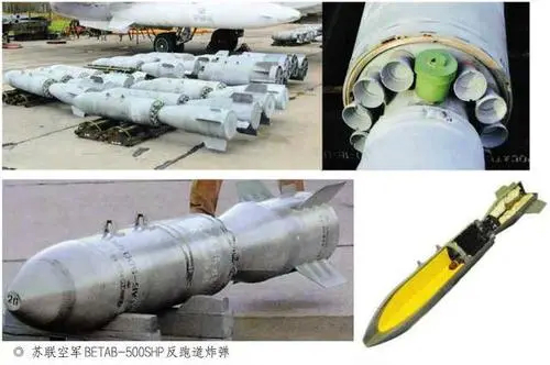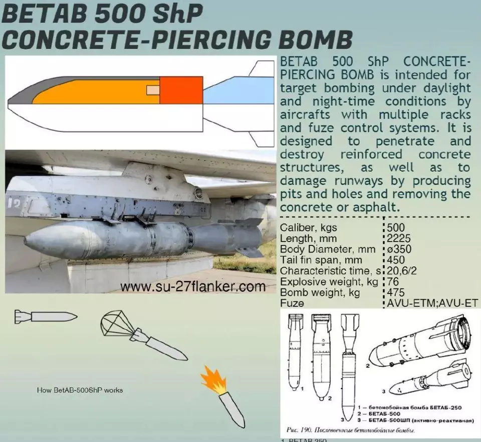 BetAB-500ShP并不是什么新式武器,而是苏联在上世纪70年代研制一种无制导航弹,这种重达510kg的炸弹分为三个部分,前端是战斗部,中间是一组火箭发动机,尾部则是一个降落伞仓。由于是无制导武器,它需要战机飞行到目标上空才能投放,投放后弹体会在降落伞的帮助下调整为与目标接近垂直的姿态,在接近目标后,自带的一组火箭发动机会启动,为弹体提供相当大的动能以侵彻坚固目标。根据苏/俄军队在阿富汗、车臣和叙利亚的实践,这种弹药最大能够侵彻550mm的钢筋混凝土结构,对机场跑道、防御工事和地下设施的打击效果很好。
