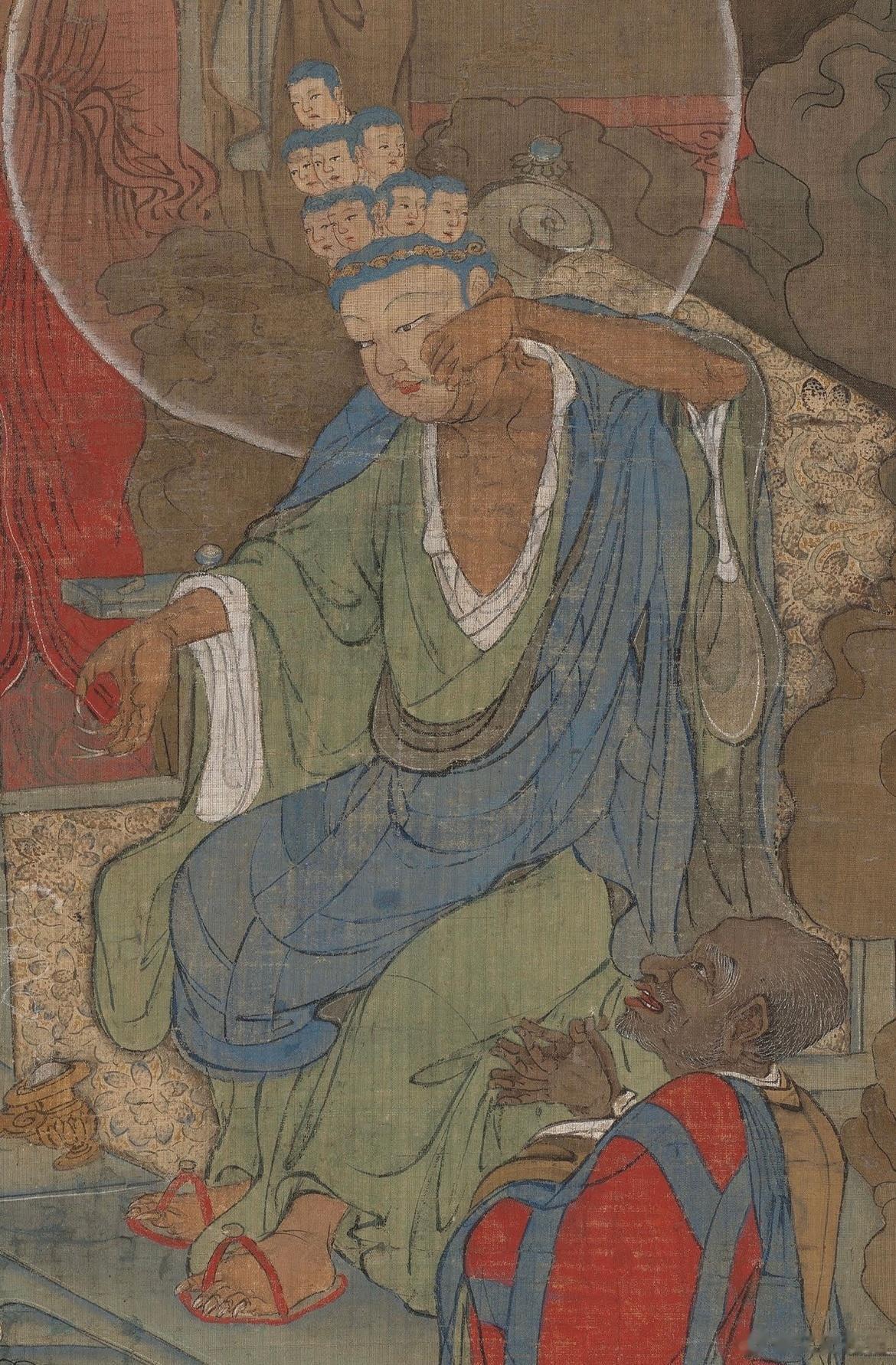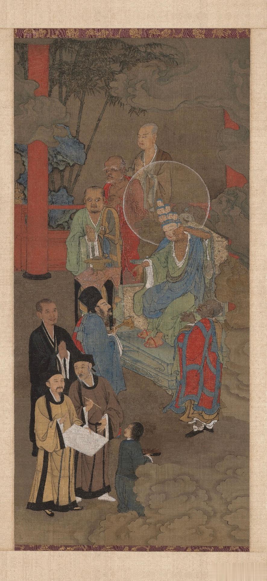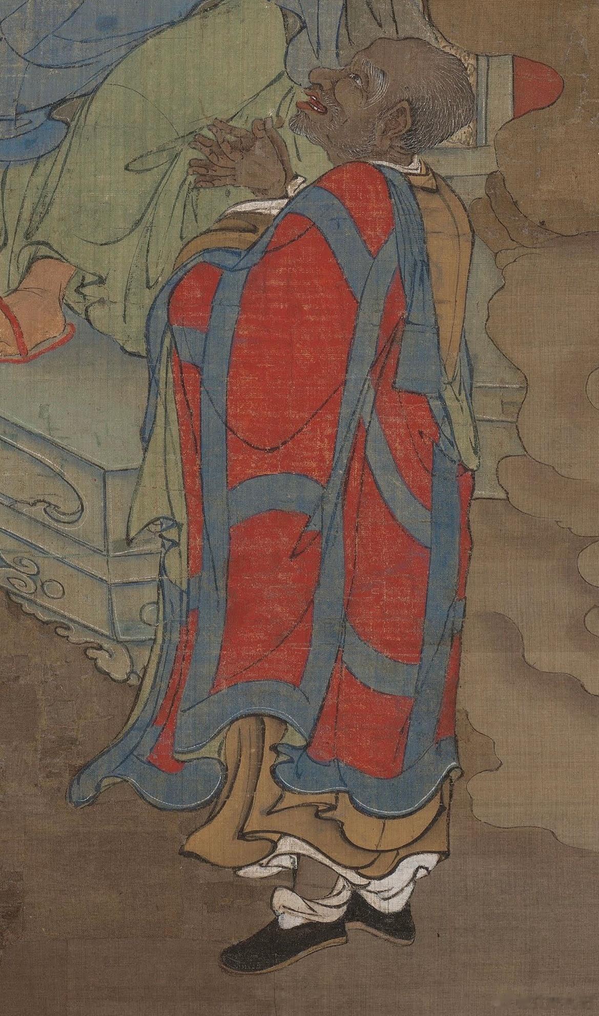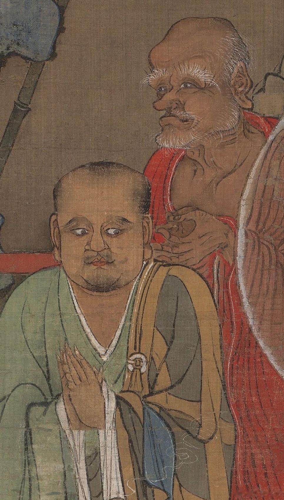 此画是波士顿美术馆从日本大德寺购买而来,所画场景比较有趣,画出了画师在进行多面罗汉的设计与写生,坐着的大罗汉应该是凡人所扮,带着的面具将脱末脱。而俩位画师在进行着讨论,后面的黑衣合掌者据说是这次绘制活动的赞助人。