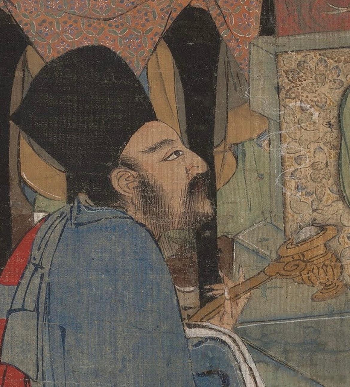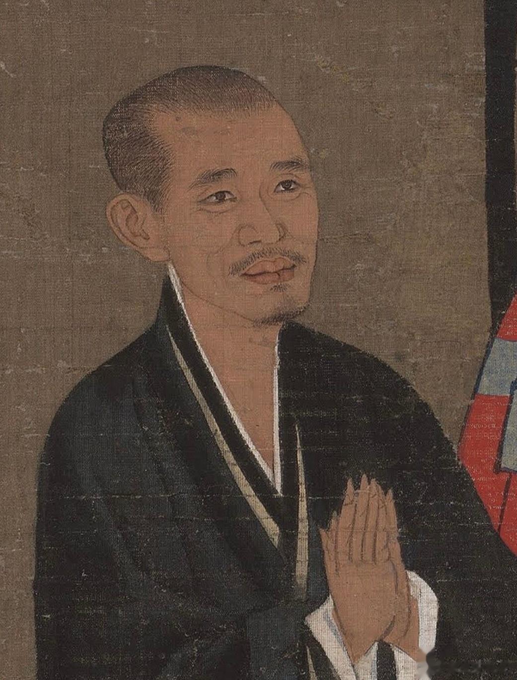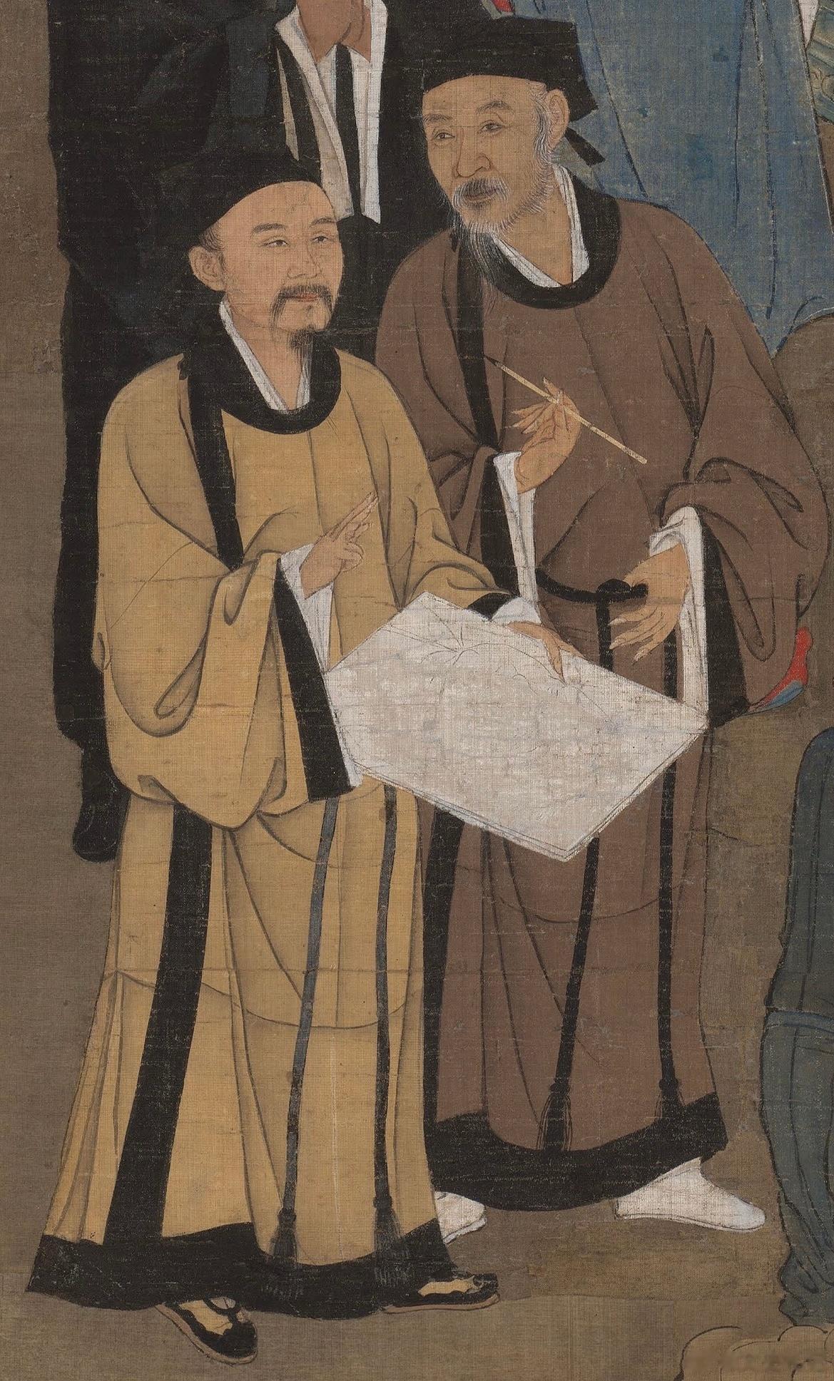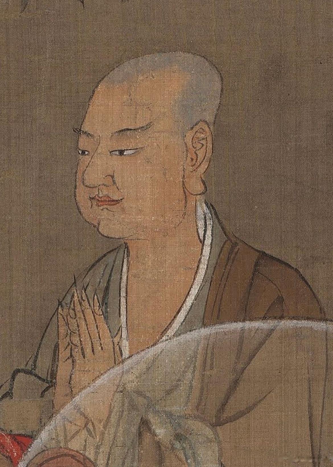 此画是波士顿美术馆从日本大德寺购买而来,所画场景比较有趣,画出了画师在进行多面罗汉的设计与写生,坐着的大罗汉应该是凡人所扮,带着的面具将脱末脱。而俩位画师在进行着讨论,后面的黑衣合掌者据说是这次绘制活动的赞助人。