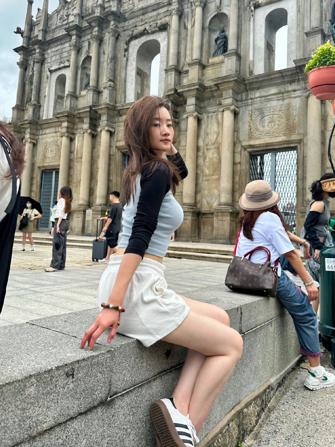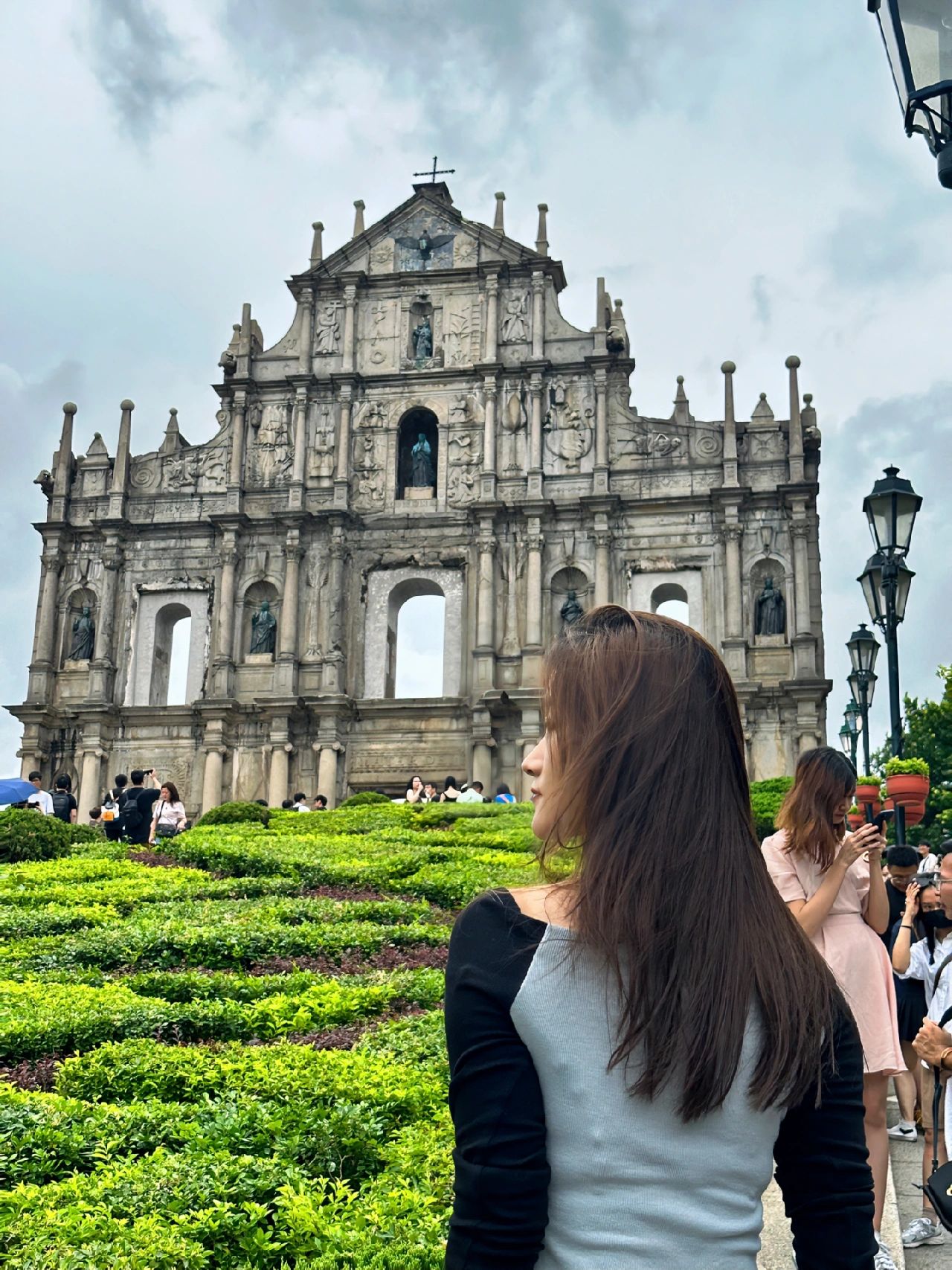 澳门必打卡景点,上台阶旁边的路灯下和大三巴旁边的台阶上都很好拍,人相对少一些,也能拍到大三巴全貌。