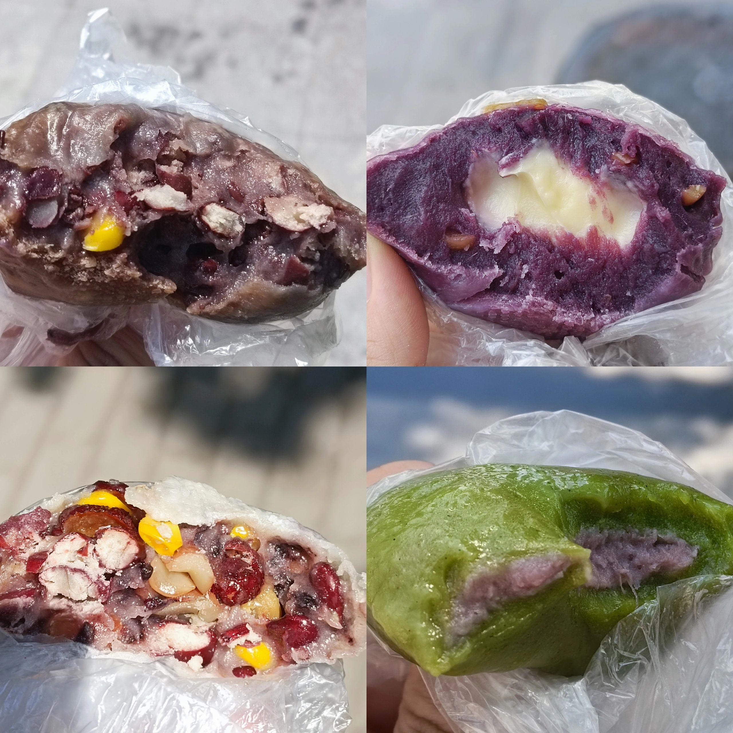 我感觉青团比粘豆包好吃,粘豆包红豆和花生板栗的不错,个人感觉紫薯爆浆奶酪太甜了,但不过毕竟这么便宜真的值得尝尝。