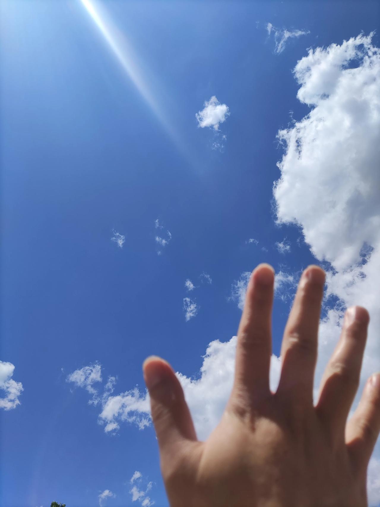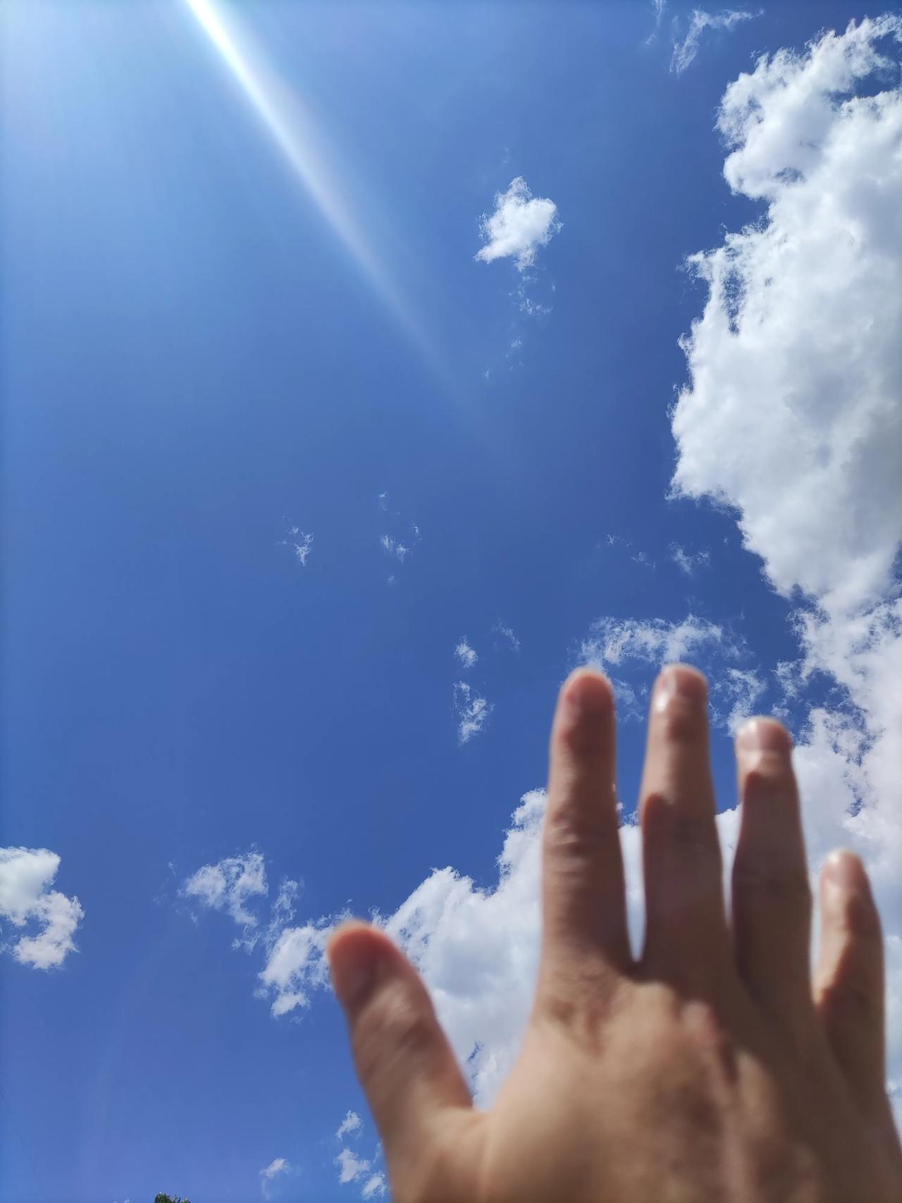 今天的天空好美! 蔚蓝中飘荡着云朵,好似一朵朵棉花糖,让自己想要伸手抓一把来尝