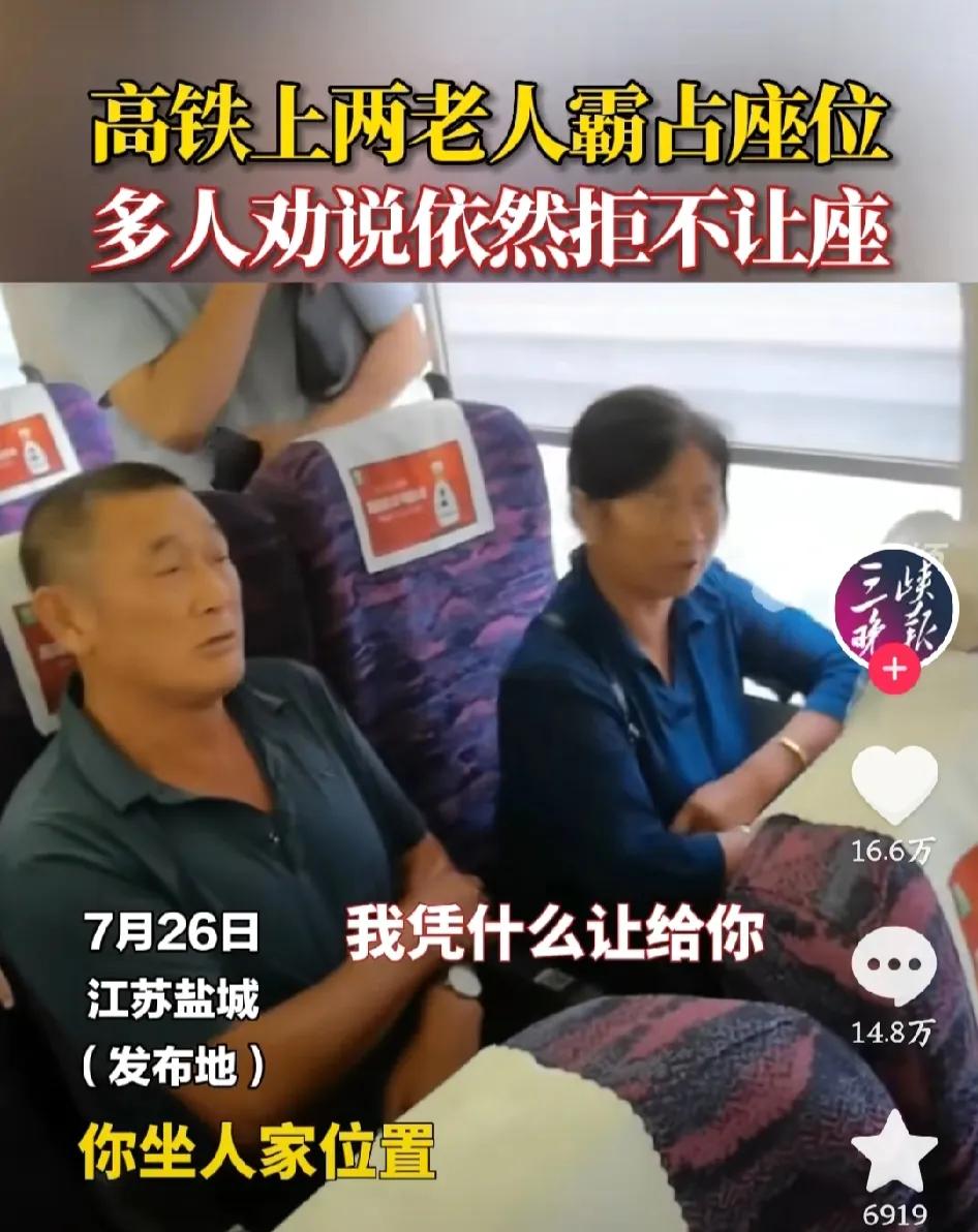 最近老人高铁霸座事件发酵挺严重。事发列车为高邮站前往盐城站。据说这俩老人是盐城建湖人。作为盐城人我觉得挺丢脸。 有人说霸座老人是不识字不懂高铁上每人固定位置的规矩。但从视频中来看,老人周围有不少热心群众提醒老人高铁座位是固定的,但老人态度嚣张,多次表示“我就不让怎么了”“我没偷没抢”“我不识字”。 下车后老人被南京铁路公安处带往警局处理,期间老人的儿子还发布声明倒打一耙,称被霸座的女子侵犯自己父母肖像权,可谓无耻至极。 网上大部分人都是在批评老人的违法与不道德行为。但还有一部分人依旧偏袒这两位霸座老人,以“农村人不懂城市的规矩”“老人不识字”“大家都会老,应该多一份包容”来给这两位霸座者洗脱。 农村人许多是不懂城市的规则,不明白城里的事物,但这不代表他们在可以在城里肆意做出影响别人权益的事。城里人不懂农村的花草树木,不懂那些粮食庄稼的生长,但破坏了农村的庄稼那也得赔钱,不能以“我不懂”来洗脱。同理不懂城市规则的农村人也一样。 此外许多人在生活中应该看到过那种“悍妇”“泼皮” ,他们总是时刻处在应激状态,因为一件小事就喜欢吵架,且越吵越兴奋,占不到便宜就觉得亏。