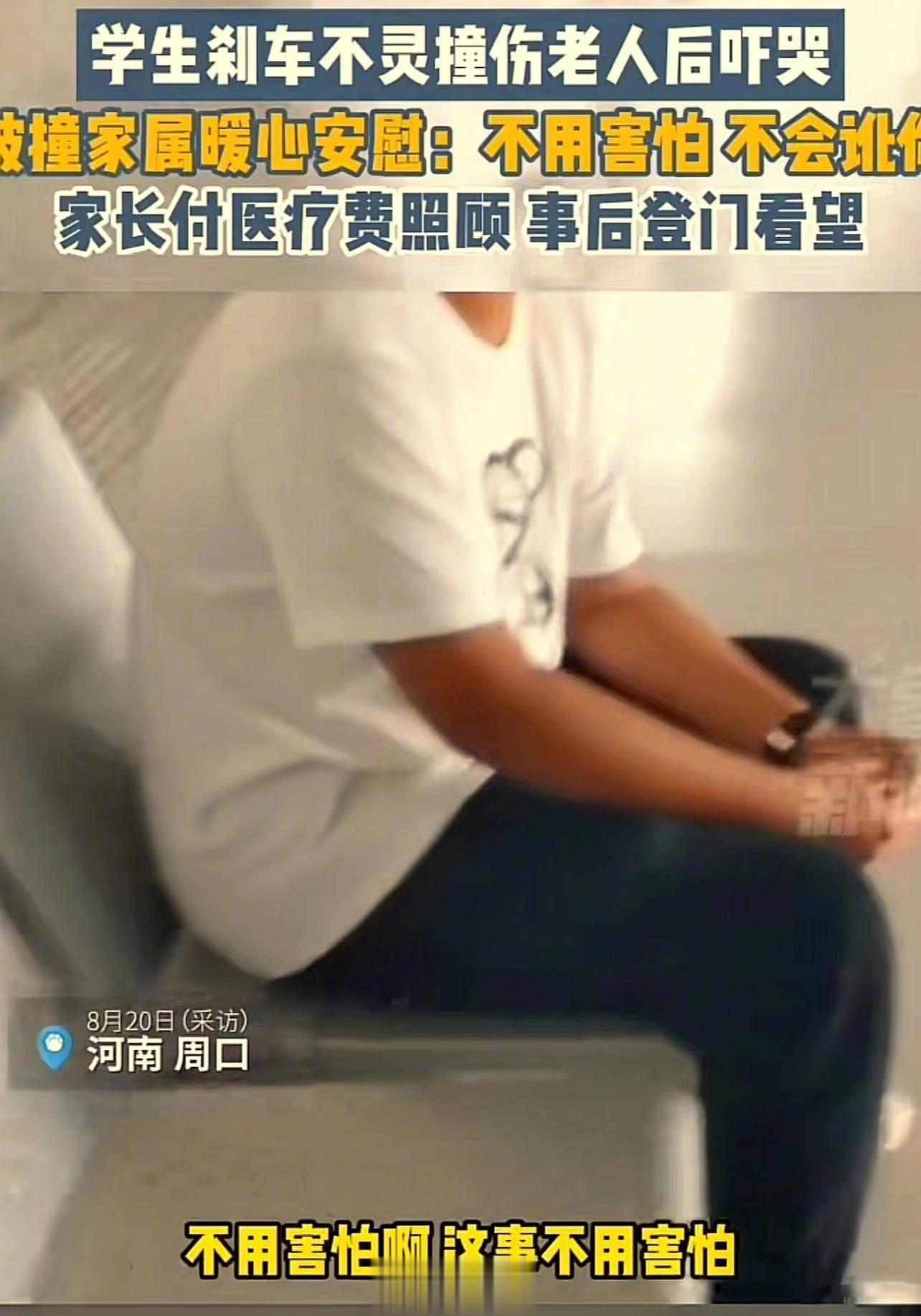 河南周口,学生骑车不小心把老太太撞倒!看到老太太头破血流,学生吓得大哭,怕老太太会提出巨额赔偿!而老太太的儿子赶到医院,看到学生坐在那里哭,他拍了拍学生说了一句话,让学生哭得更厉害了!网友:有什么样的父母就有什么样的孩子!