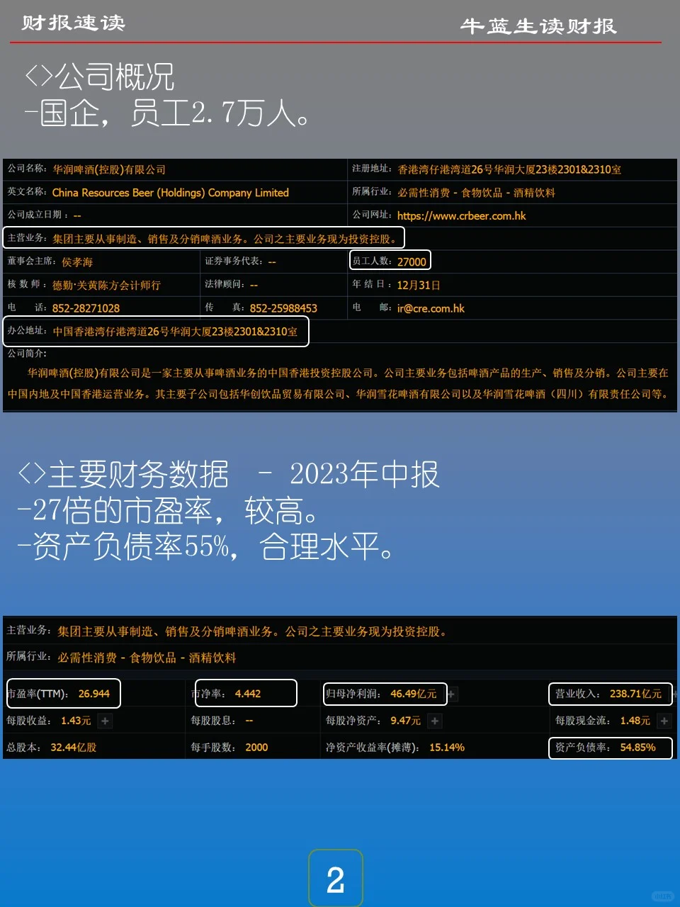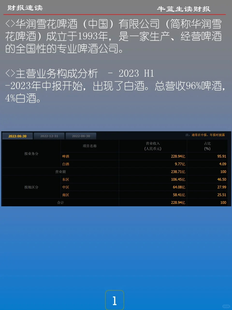 ✈华润雪花啤酒(中国)有限公司(简称华润雪花啤酒)成立于1993年,是一家生产、经营啤酒的全国性的专业啤酒公司。 主营业务构成分析 – 2023 H1 -2023年中报开始,出现了白酒。总营收96%啤酒,4%白酒。