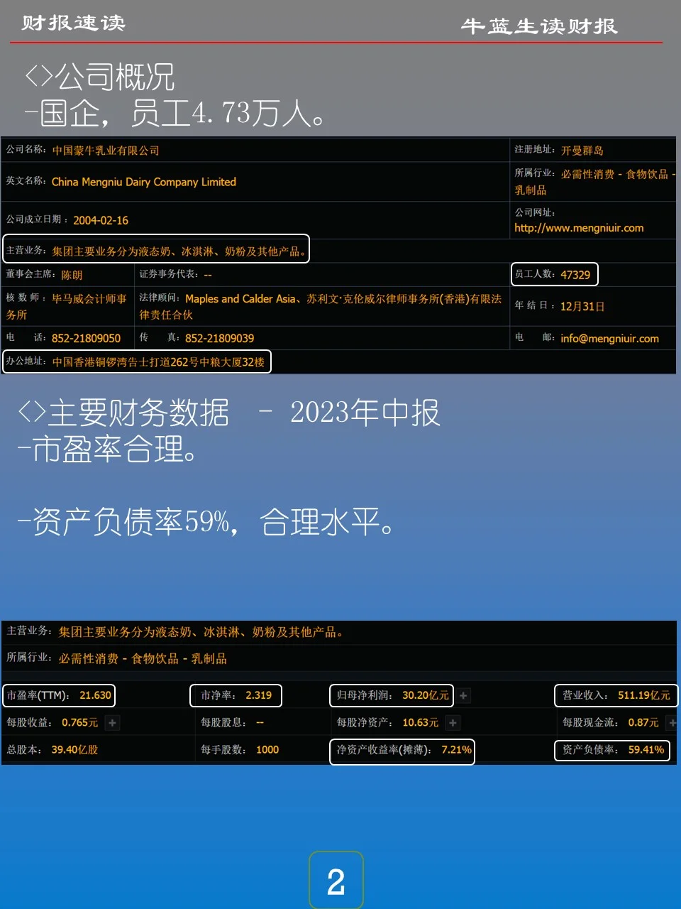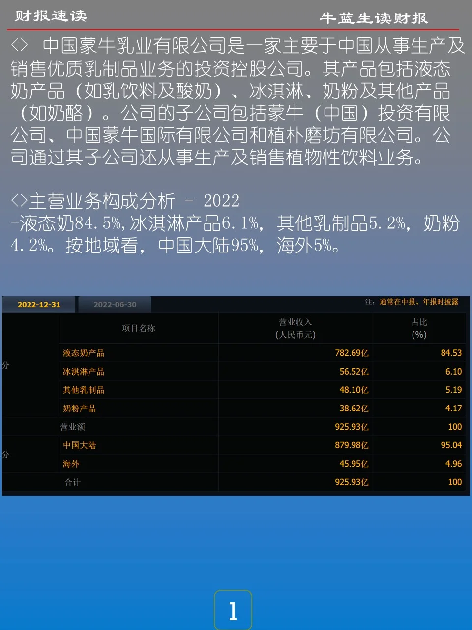 ✈中国蒙牛乳业有限公司是一家主要于中国从事生产及销售优质乳制品业务的投资控股公司。其产品包括液态奶产品(如乳饮料及酸奶)、冰淇淋、奶粉及其他产品(如奶酪)。公司的子公司包括蒙牛(中国)投资有限公司、中国蒙牛国际有限公司和植朴磨坊有限公司。公司通过其子公司还从事生产及销售植物性饮料业务。 主营业务构成分析 - 2022 -液态奶84.5%,冰淇淋产品6.1%,其他乳制品5.2%,奶粉4.2%。按地域看,中国大陆95%,海外5%。