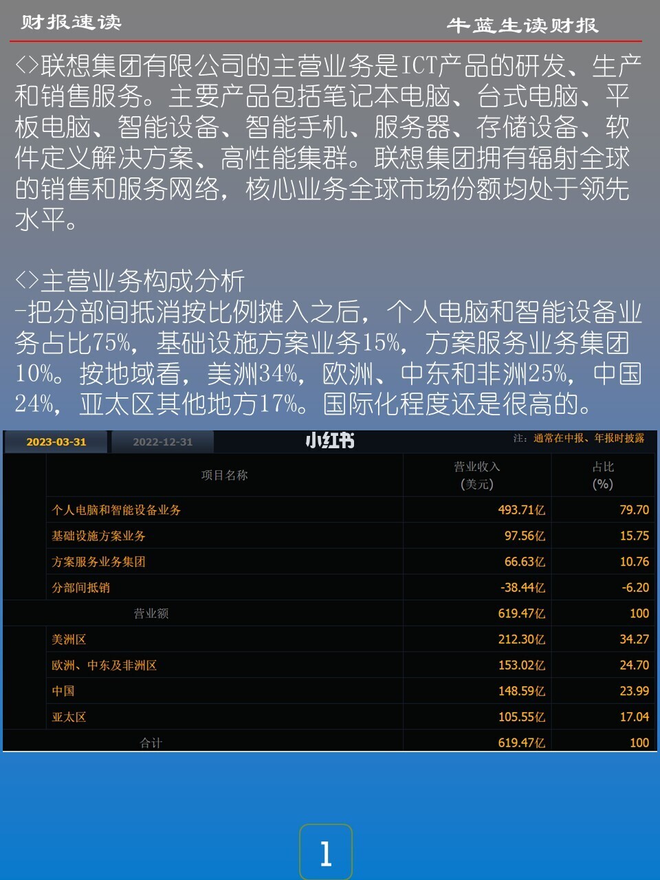 ✈联想集团有限公司的主营业务是ICT产品的研发、生产和销售服务。主要产品包括笔记本电脑、台式电脑、平板电脑、智能设备、智能手机、服务器、存储设备、软件定义解决方案、高性能集群。联想集团拥有辐射全球的销售和服务网络,核心业务全球市场份额均处于领先水平。 主营业务构成分析 -把分部间抵消按比例摊入之后,个人电脑和智能设备业务占比75%,基础设施方案业务15%,方案服务业务集团10%。按地域看,美洲34%,欧洲、中东和非洲25%,中国24%,亚太区其他地方17%。国际化程度还是很高的。