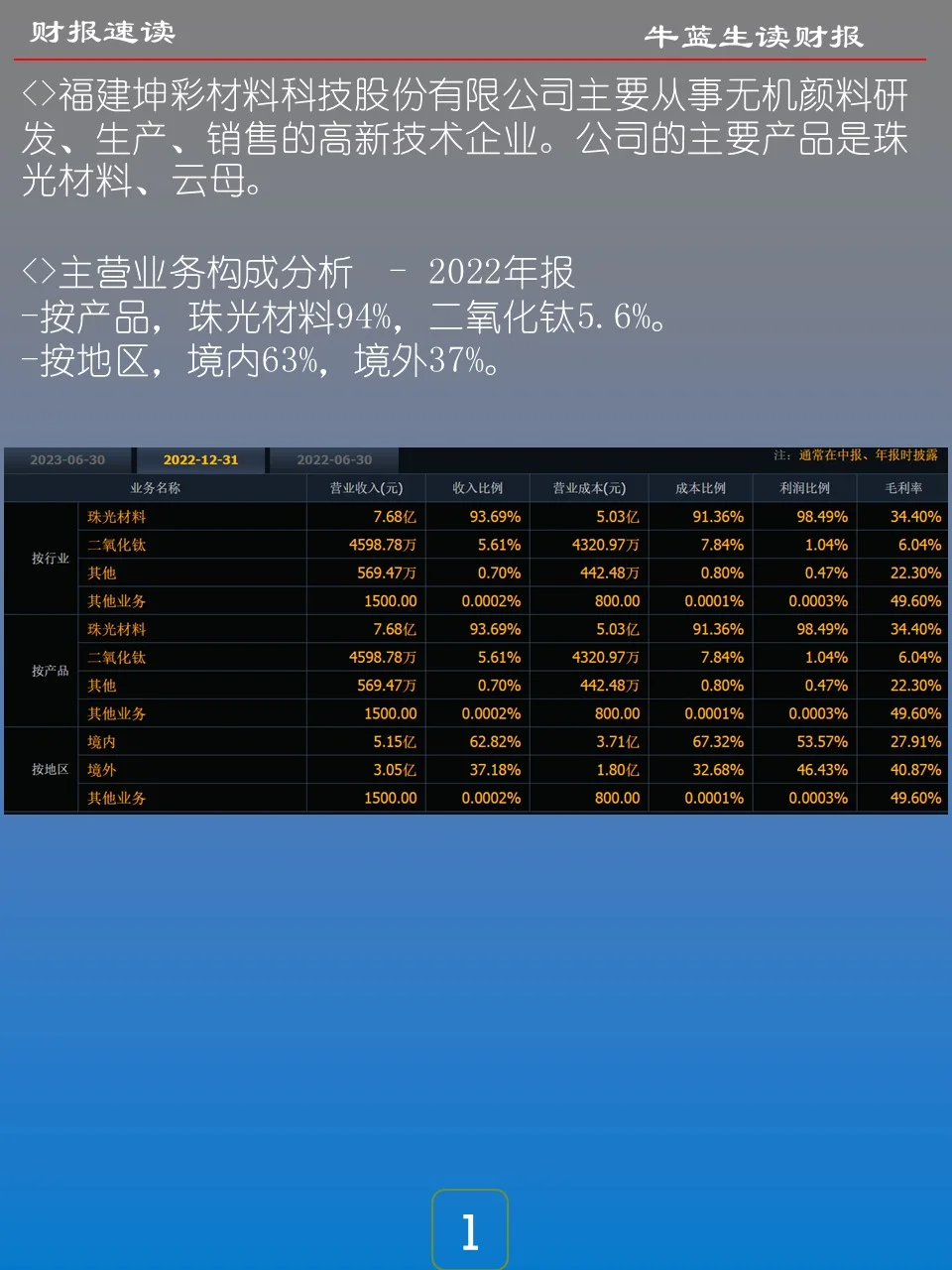 福建坤彩材料科技股份有限公司主要从事无机颜料研发、生产、销售的高新技术企业。公司的主要产品是珠光材料、云母。 主营业务构成分析 – 2022年报 -按产品,珠光材料94%,二氧化钛5.6%。 -按地区,境内63%,境外37%。