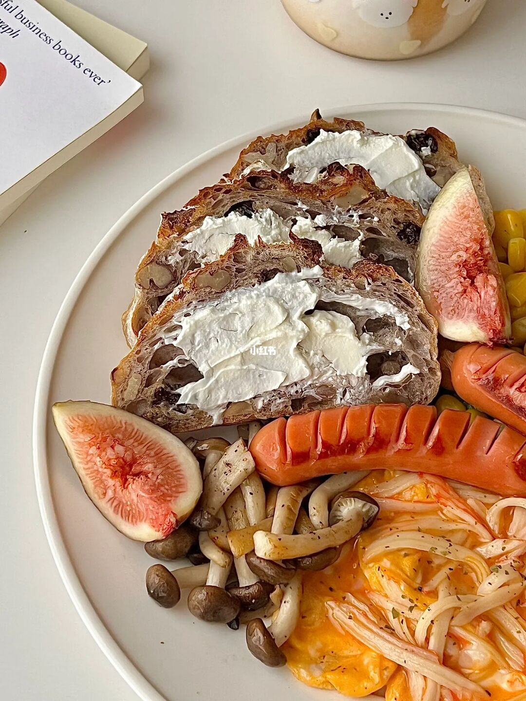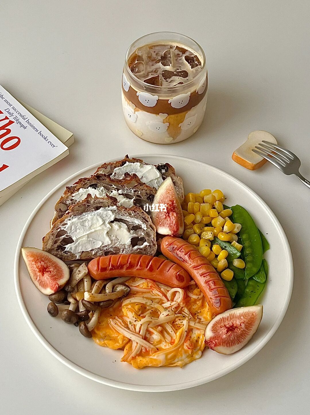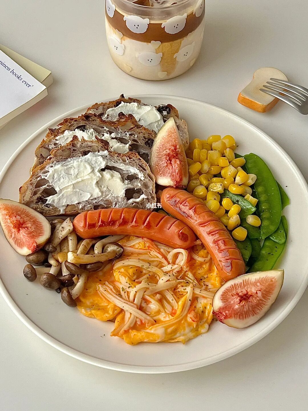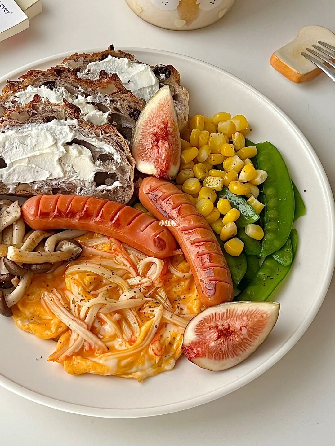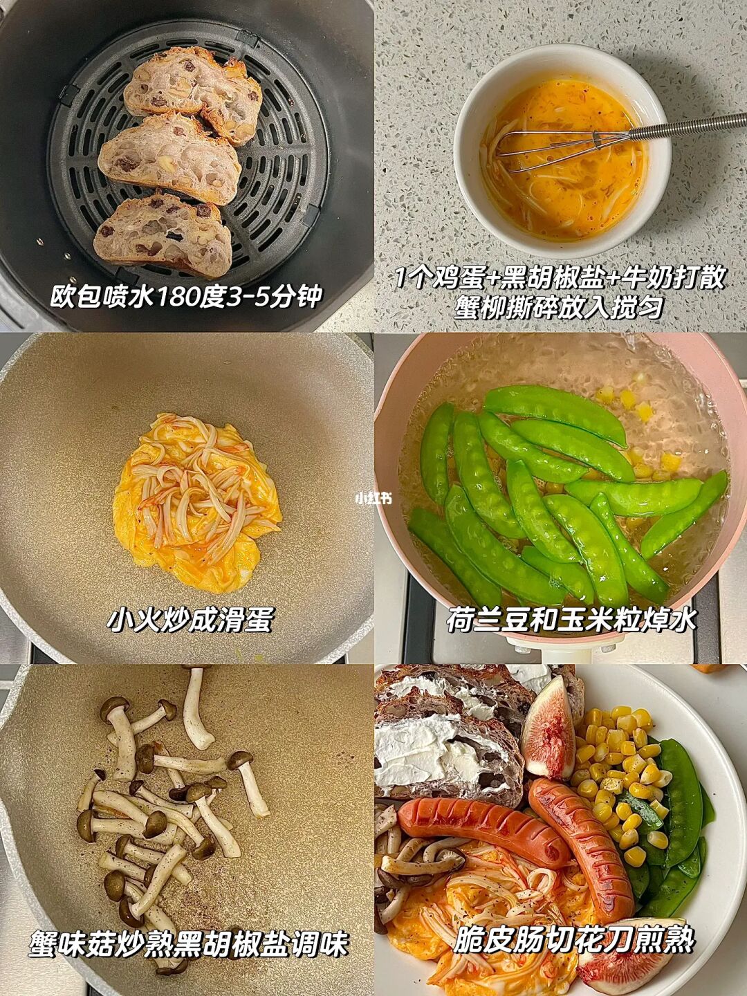 吃来吃去就还是那几样🥖🫛🍳🍖 - 1️⃣核桃恰巴塔欧包喷水放入空气炸锅180度复烤3-5分钟,抹上原味奶酪 2️⃣鸡蛋+牛奶+黑胡椒盐打散,蟹柳撕碎放入搅匀,不粘锅少许油小火炒成蟹柳滑蛋 3️⃣脆皮肠切花刀小火煎熟,玉米粒和荷兰豆焯水,蟹味菇炒熟,黑胡椒盐调味 -