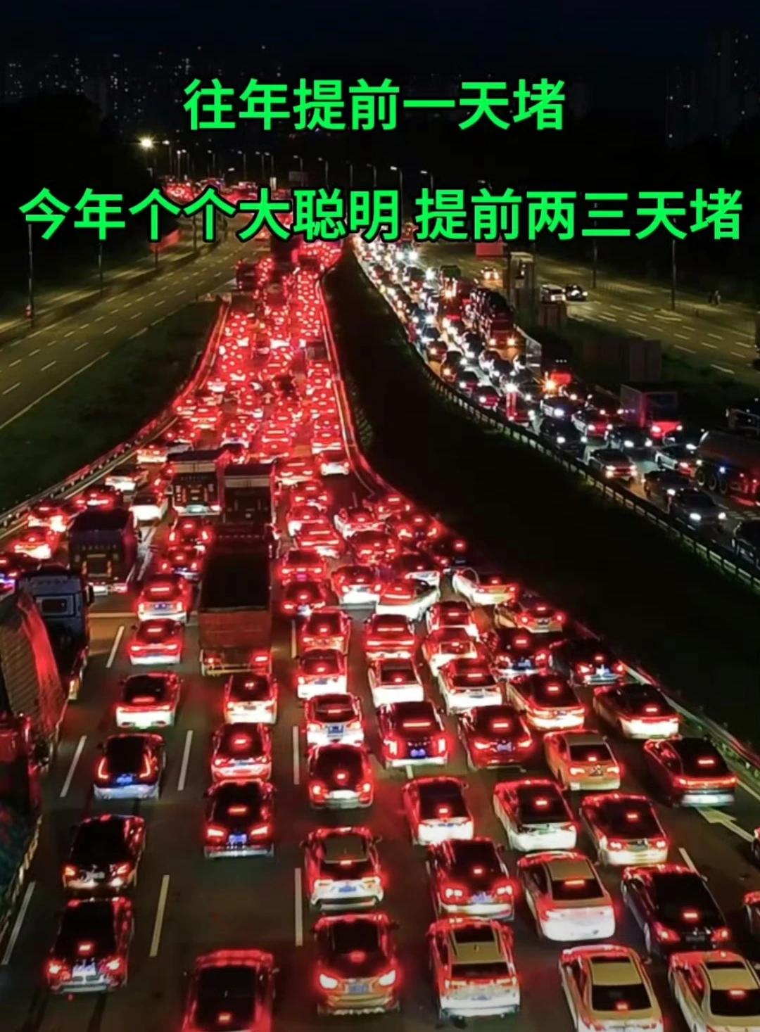 昨天今天开始上路的人都是《大聪明》! 当聪明人遇到许多聪明人, 结果就是,都被堵在了路上。[捂脸] 可以预想,如果路途较远, 出发堵三天,回来堵三天, 于是休了个寂寞,还是两天[捂脸]