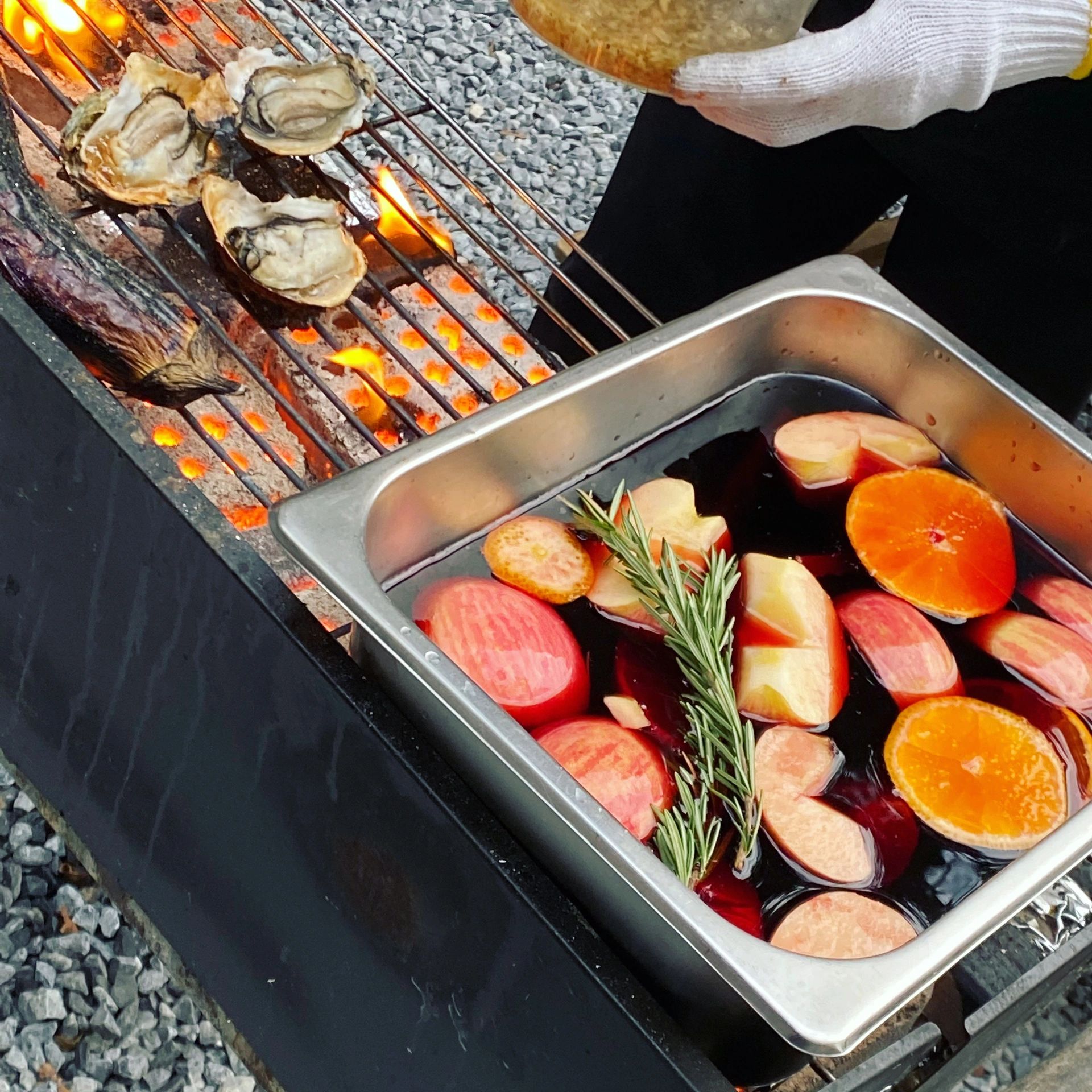 刚好和朋友们一起来露营,有服务员给我们烧烤弄吃的,秋冬煮一下热红酒🍷,超级惬意~