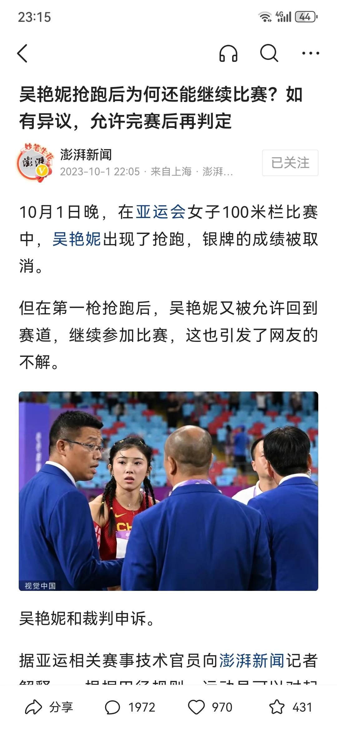吴艳妮,真的有点冤! 真正看了比赛的都知道,吴艳妮这边申诉是印度选手第一枪先动了才影响到她抢跑! 首先,被罚下吴艳妮是接受的,同样被罚下的印度选手去申诉说吴艳妮影响她,裁判看了回放,起跑器数据显示印度选手也确实动了,一时无法当场作出判罚 所以裁判对吴艳妮说的是“先比赛,你可以跑,但成绩不一定算”... 后来吴艳妮才去跟裁判沟通,大致意思是她说我影响她,我还觉得她影响我呢,裁判用机器看数据发现印度选手居然比吴艳妮先动只是她又收回去了,但吴艳妮被影响却没收住,直接跑了出去,冤不冤 ? 所以吴艳妮就尝试把这些讲出来,而裁判让先跑后判,事情就是这样。 看动图吴艳妮先动了,但是这得看脚下的压力器,不是看你人出的多,肉眼不一定看的出来,最终还是靠机器。