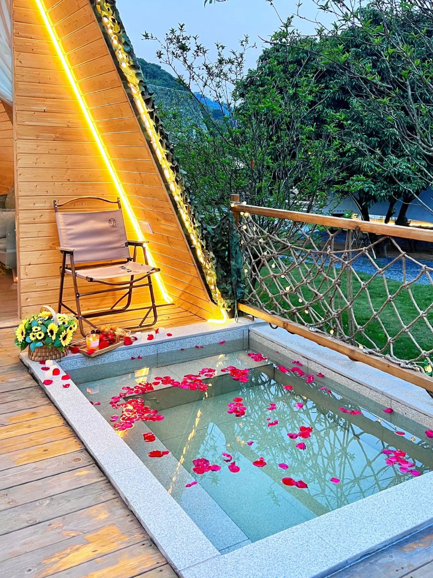 最美好的时光就是有大自然🌳🌲有阳光☀️🌞有美食🍲🍲有三五知己👬👨👩👧👦 而露营则是一起享受大自然,对大部分人来说,也是一种新的生活方式。 让我们从繁忙的都市生活中抽离出来,享受片刻的安静。 早上被清脆的鸟叫声🐦🐦吵醒,晚上在露台一边看着露天电影🎬🎬一边泡着私汤♨️♨️ 听着虫鸣睡在帐篷里⛺️⛺️感觉身体回归到大自然。 这次露营我们选择了外婆家泉林秘境营地,作为第一次露营的小白, 们只带了自己的衣服👔👔充电器,而剩下的这个营地几乎提供了所有。