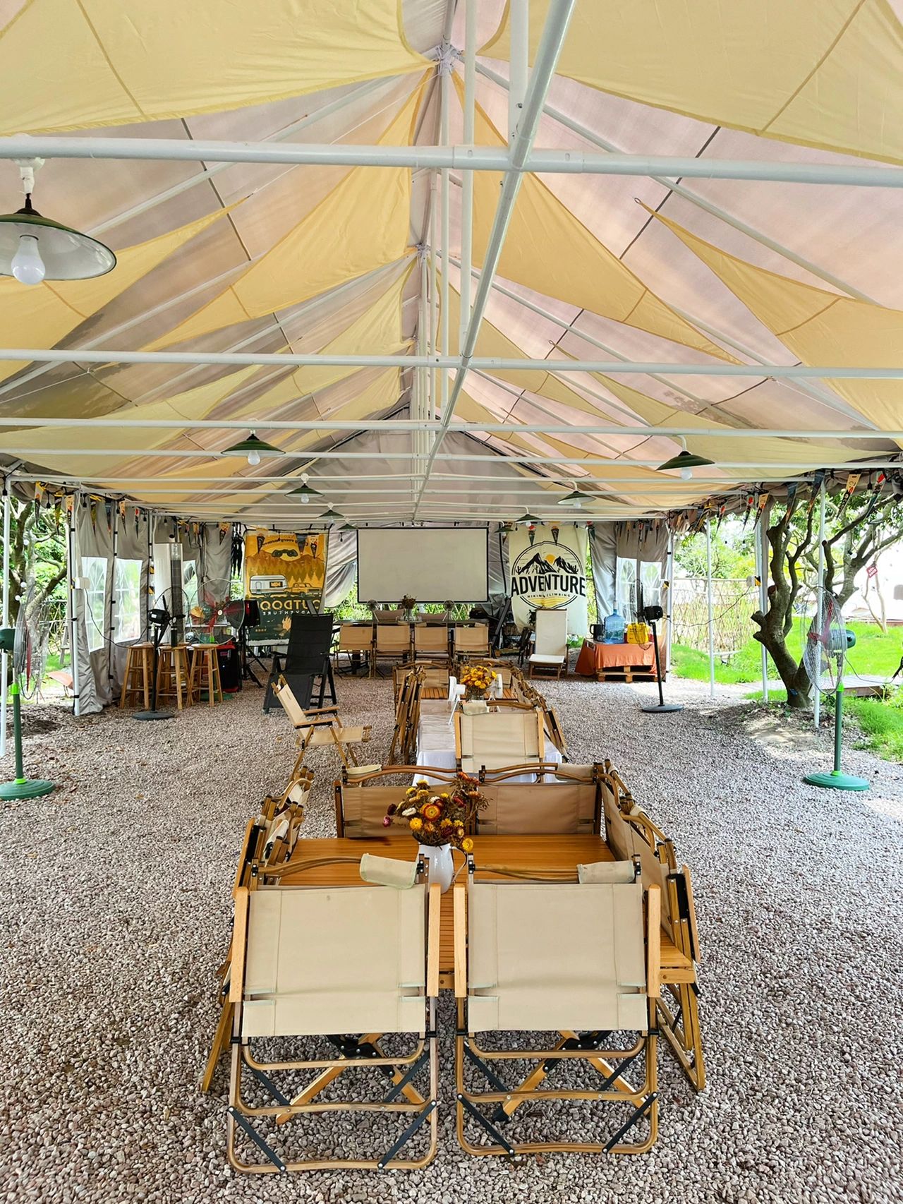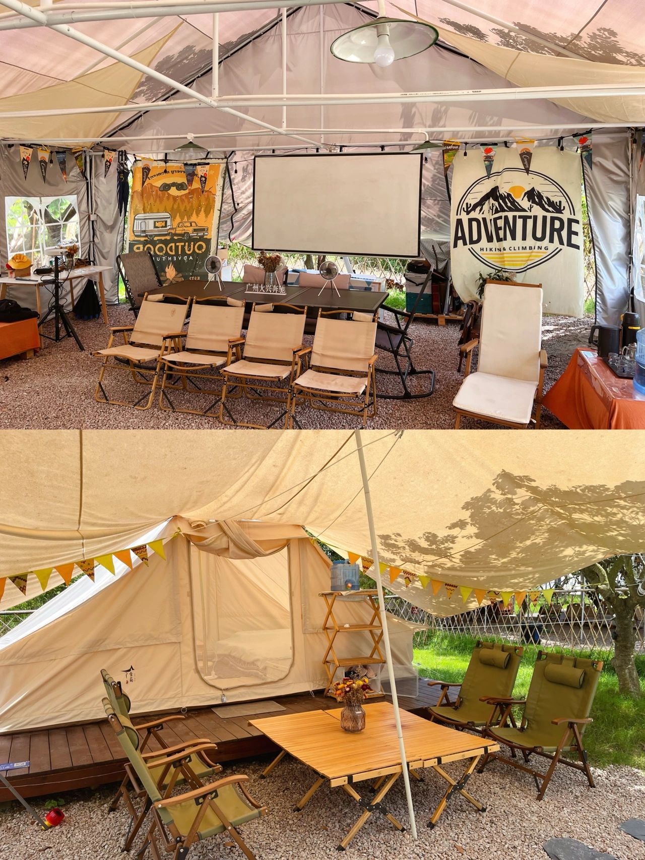 露营主区域放置了可容纳五六十人的露营桌椅🪑
