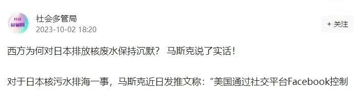 马斯克对日本核污水排海事件发表不满!发推文指责美国西方等国!声称美国这是在用脸书