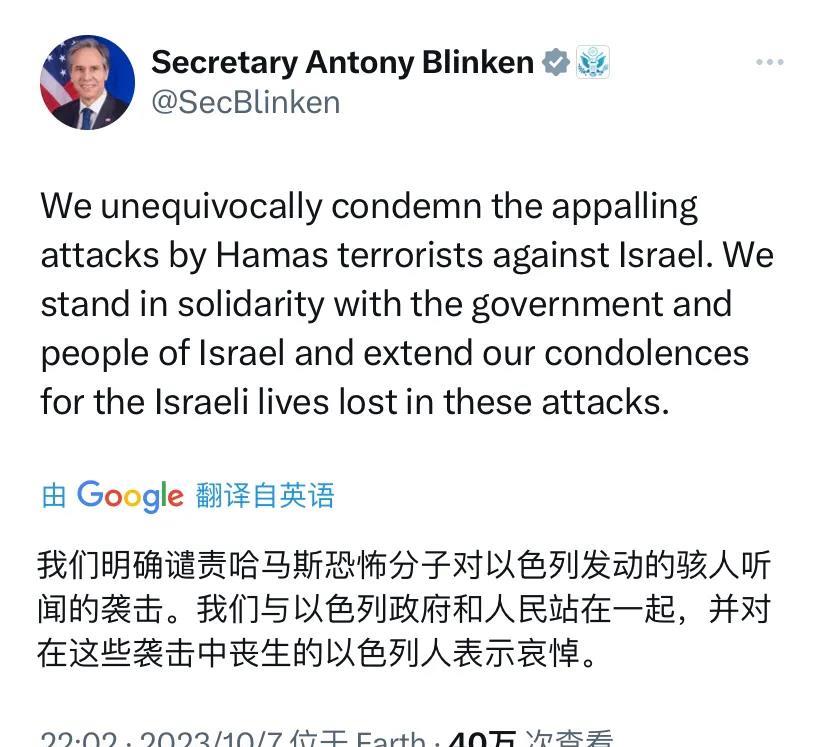 美国国务卿布林肯(北京时间10月7日晚)写道:“我们明确谴责哈马斯恐怖分子对以色列发动的骇人听闻的袭击。我们与以色列政府和人民站在一起,并对在这些袭击中丧生的以色列人表示哀悼。”