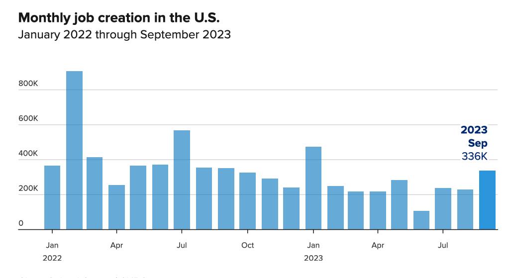 美国明年会发生什么,我不知道。反正我们从我们的课本上早就知道:资本主义定期要爆发经济危机。上次危机是在2008年,已经过去了整整15年了。按道理,这些(以美国为代表)资本主义国家早就该经历一回了。或许不是不来,只是时候未到。什么时候来?我不知道。什么会是导火索?我也不知道。所以,与其去琢磨人家啥时候崩,不如看看人家现在的经济情况。昨天我看到这样一则消息:就在今年9月的30天里美国的非农就业人数增加了33.6万人,好于道琼斯市场普遍预期的17万人。 此外,9月平均时薪增长0.2%,同比增长4.2%,而分别估计为0.3%和4.3%。9月的失业率为3.8%,而预测为3.7%。据称,休闲业和酒店业带动了就业增长,其次是政府开支和医疗保健。图1是相关报道截图;图2是美国从2022年1月以来每月新增就业岗位的变化柱状图。9月的新增就业人数是2023年1月(不含1月)以来最多的。美国的Key Private Bank首席投资官乔治·马特约说:“放缓?什么放缓?美国劳动力市场继续表现出惊人的实力,上个月创造的新工作岗位数量几乎是预期的两倍。”