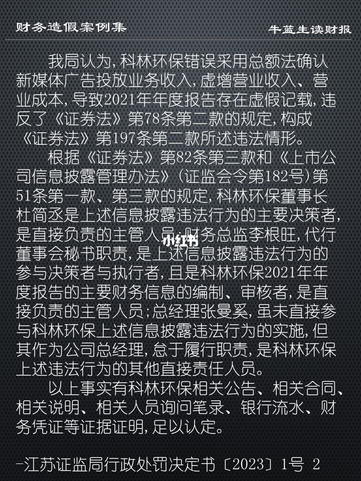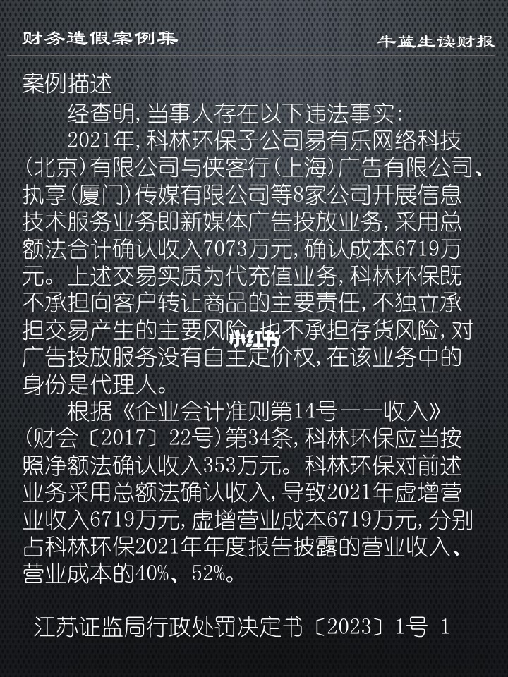 -2021年,科林环保子公司开展信息技术服务业务即新媒体广告投放业务,采用总额法合计确认收入7073万元,确认成本6719万元。上述交易实质为代充值业务,科林环保在该业务中的身份是代理人。 -根据《企业会计准则第14号——收入》第34条,科林环保应当按照净额法,确认收入353万元。科林环保对前述业务采用总额法确认收入,导致2021年虚增营业收入6719万元,虚增营业成本6719万元,分别占科林环保2021年年度报告披露的营业收入、营业成本的40%、52%。