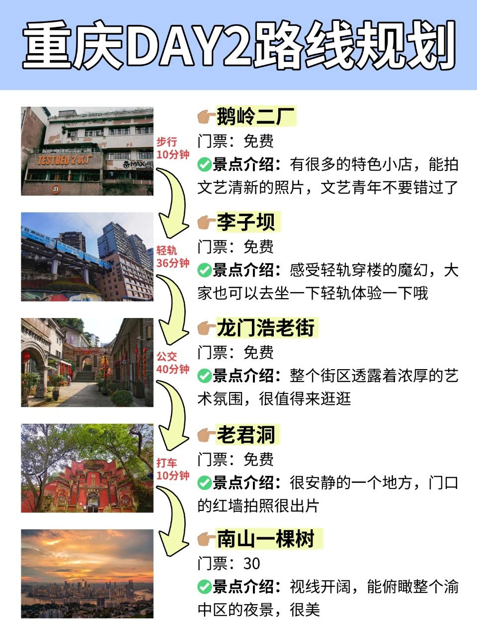 鹅岭二厂→李子坝→龙门浩老街→老君洞→南山一棵树