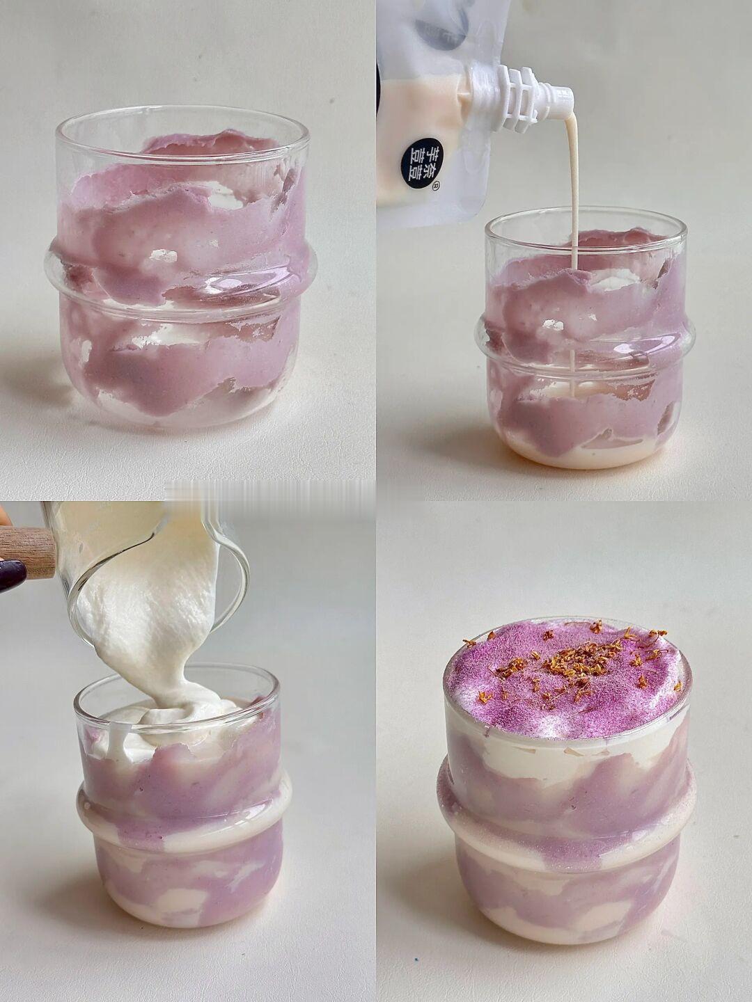 上面倒入奶盖,撒上紫薯粉和桂花装饰