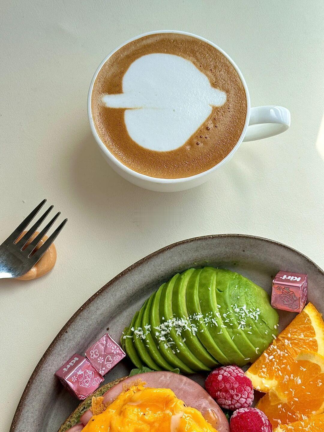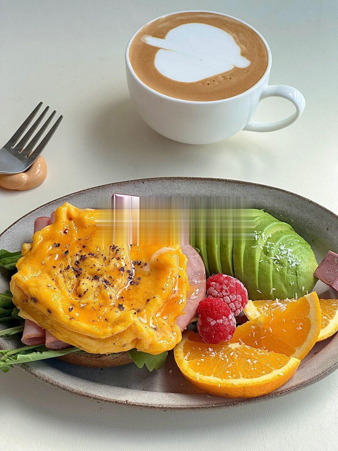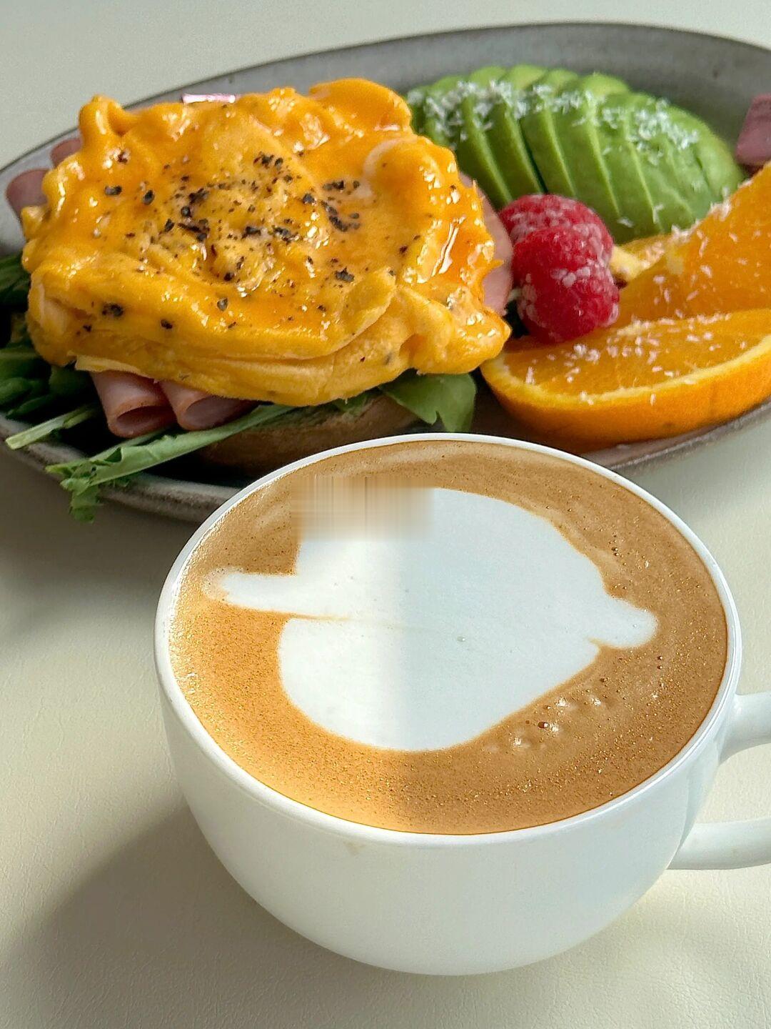 今日份早餐是一份营养满满的早餐盘哦 贝果对半切开,上面铺上芝麻菜、火腿片、滑蛋 再摆上了牛油果🥑、橙子🍊、奶酪小方🧀️、树莓 今日份拉花练习的大白心有进步耶 继续加油呀