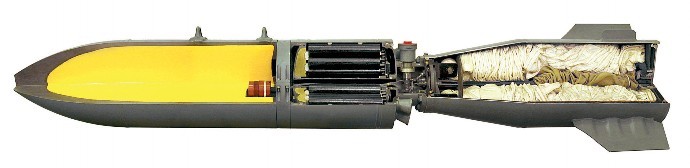 #动图# BETAB500反跑道炸弹的工作过程:降落伞减速,使姿态近似垂直地面,然后火箭发动机加速钻入土中,然后延时爆炸